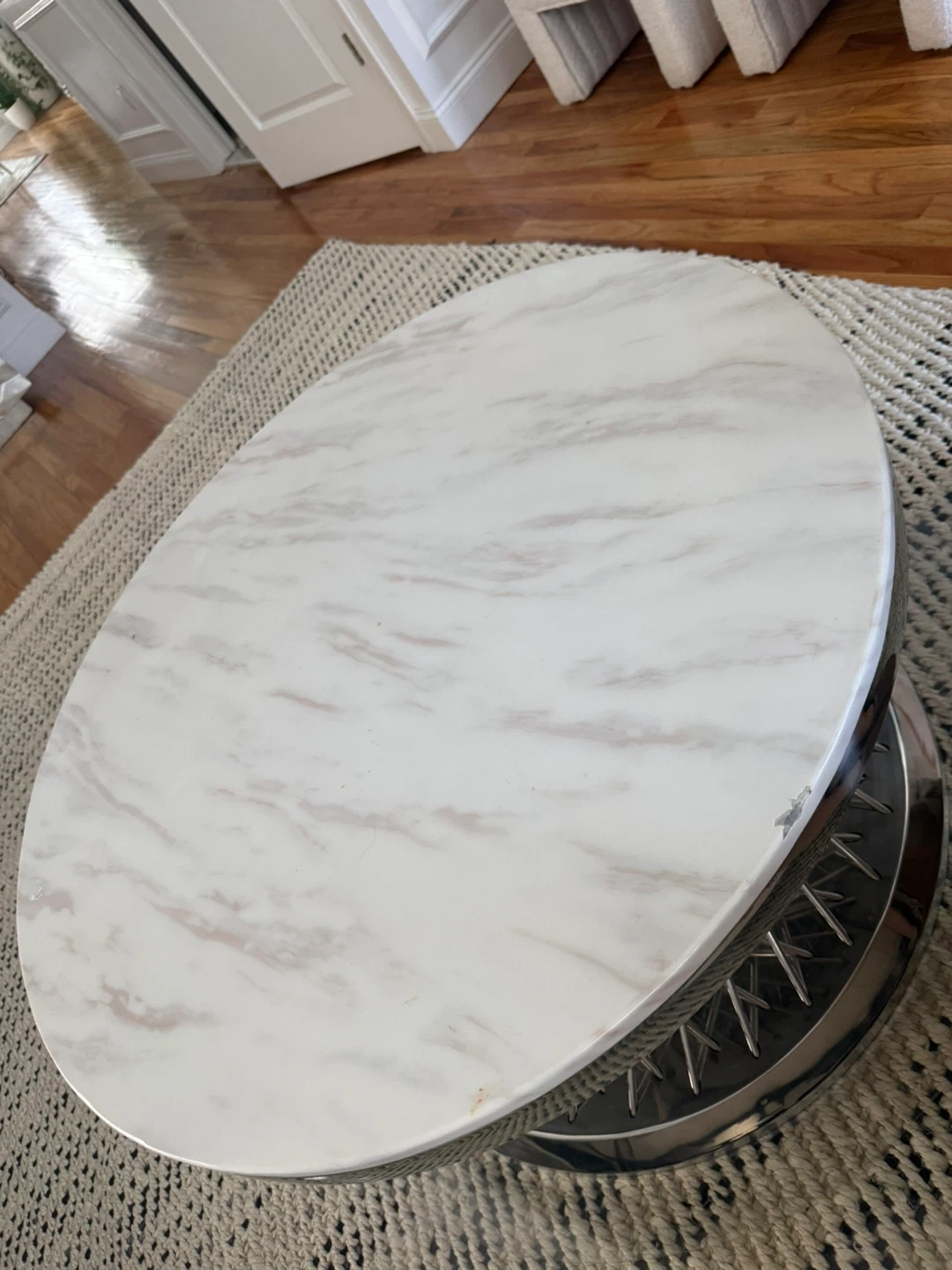 This round coffee table features a marble-look top and a unique silver metal base. It's a stylish accent for your living space. The table has a diameter of approximately 32 inches and a height of about 18 inches. Minor chip on corner.