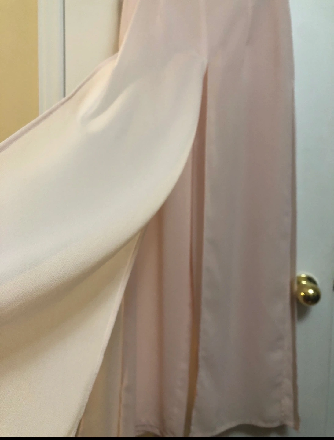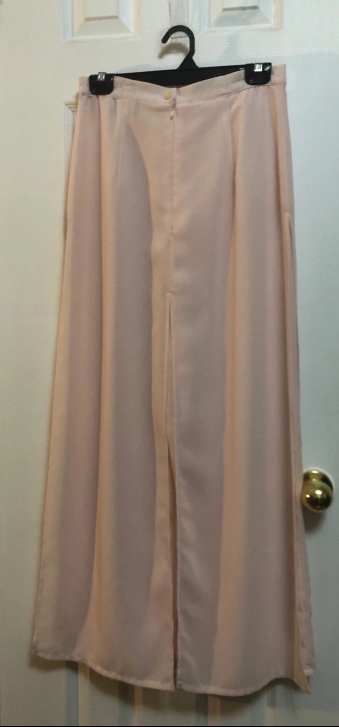 Long, flowing pink maxi skirt pants. Features a centre-back zipper and side slits. Lightweight fabric, perfect for special occasions, very unique design!