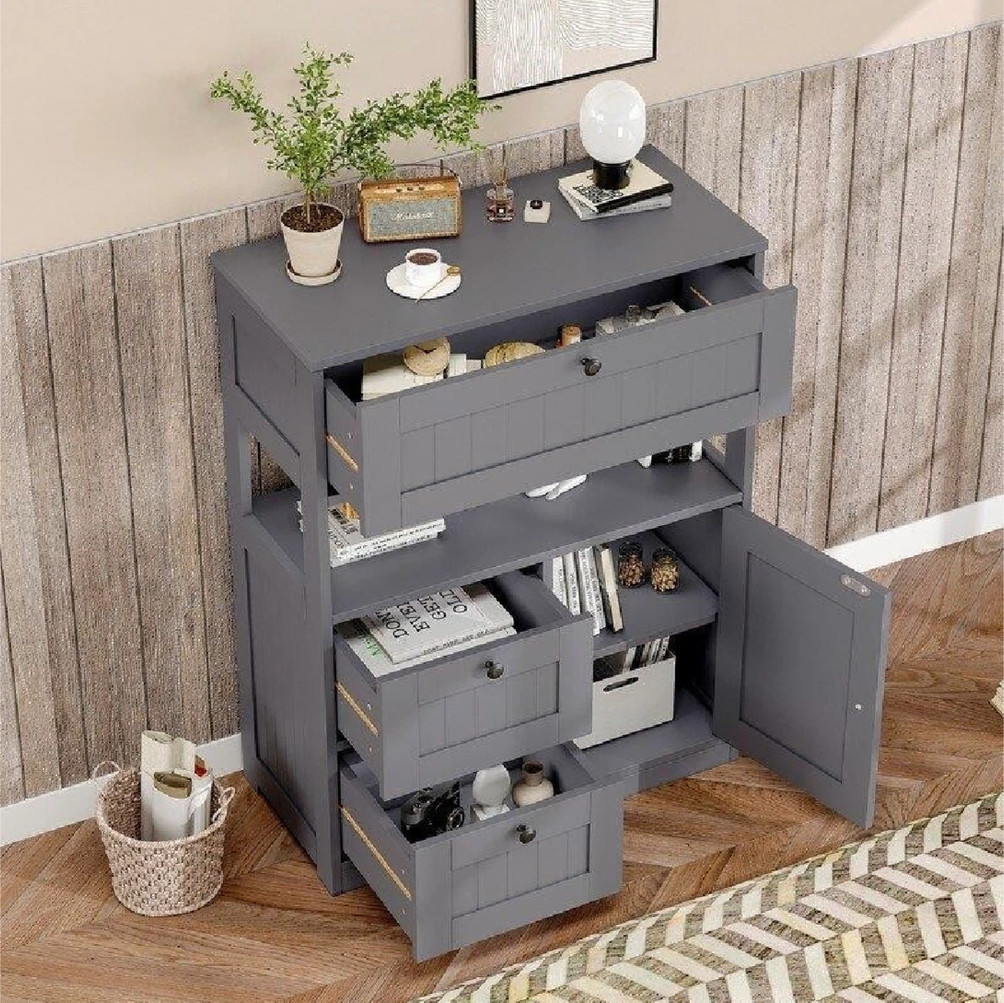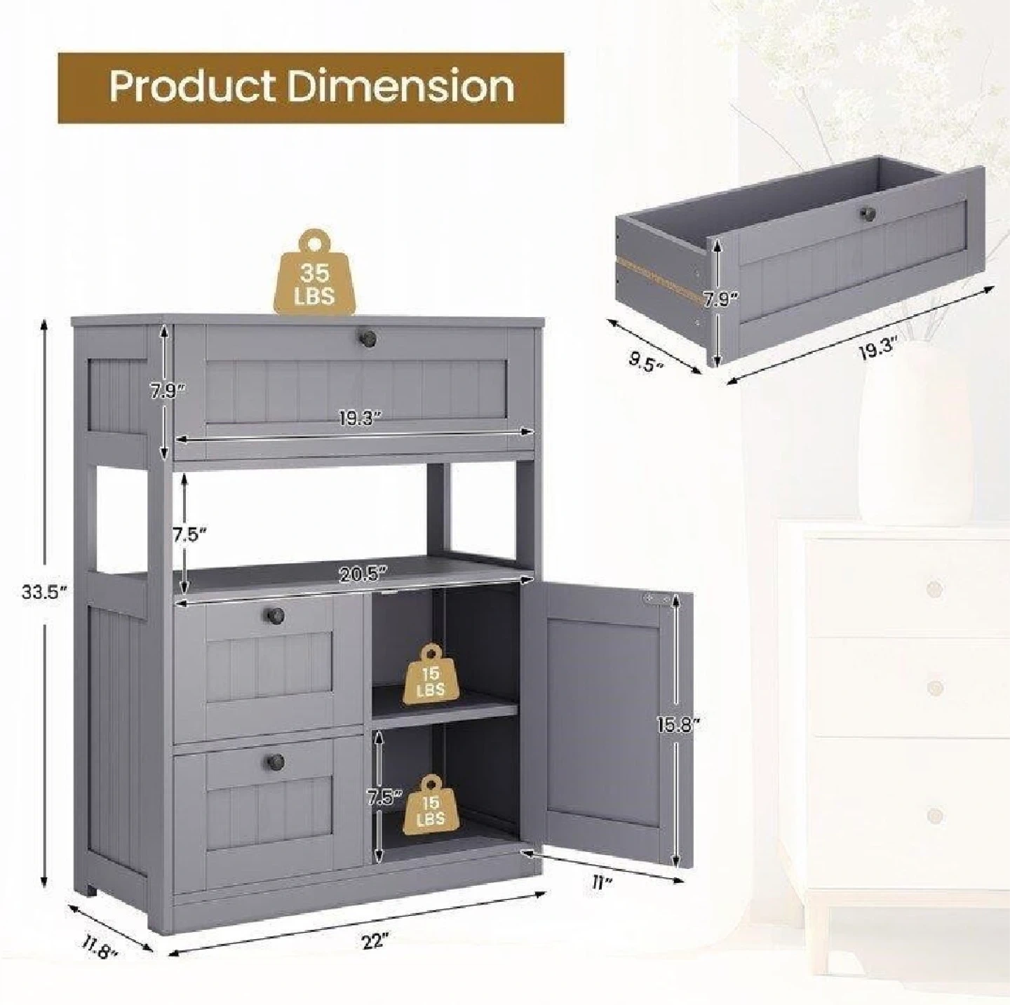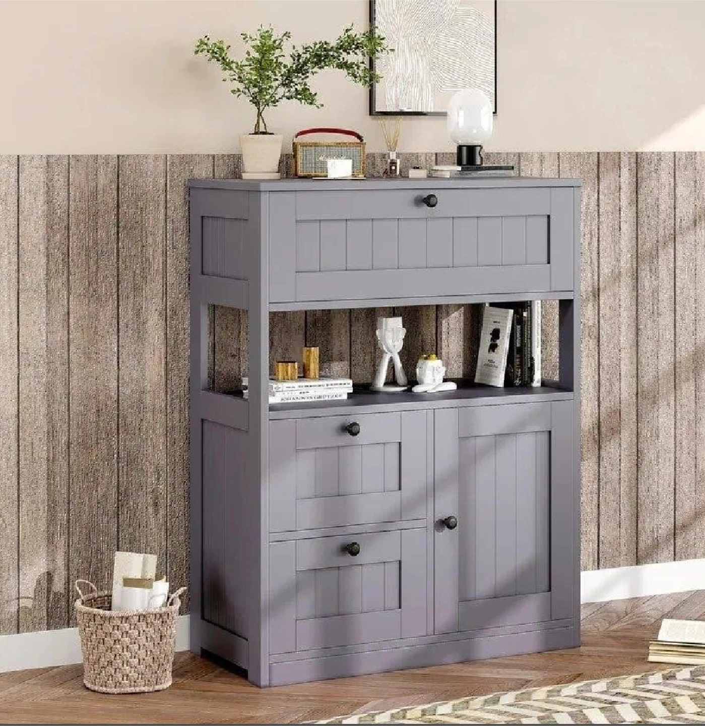 This grey storage cabinet offers versatile storage with adjustable shelves. It features three drawers and a two-door cabinet space. Dimensions are 22" wide, 11.8" deep, and 33.5" tall. The shelves are adjustable to hold items of varying heights.
