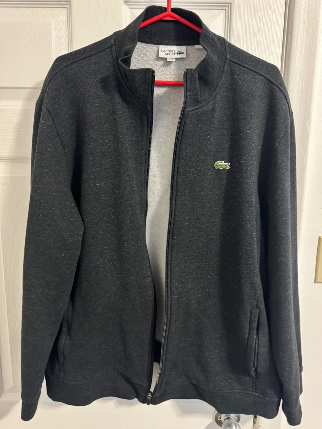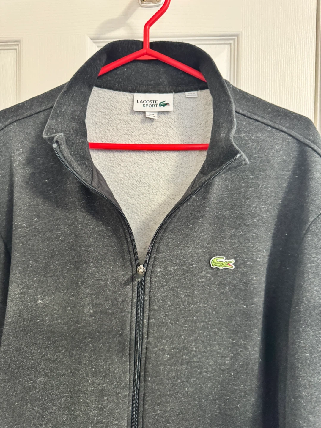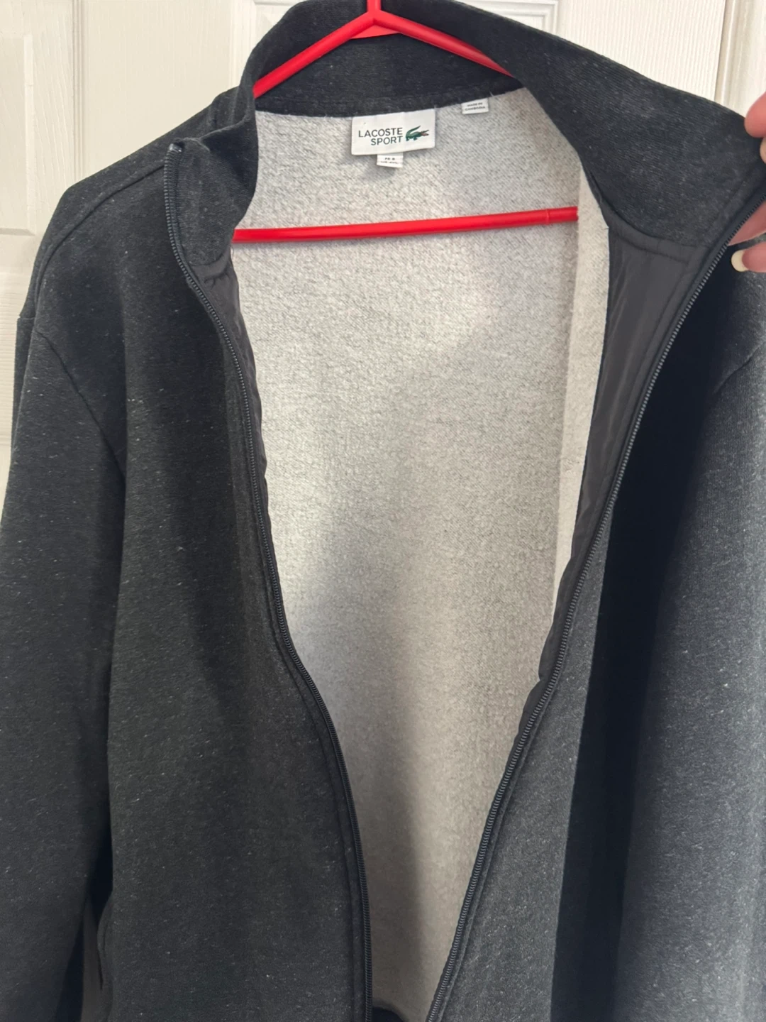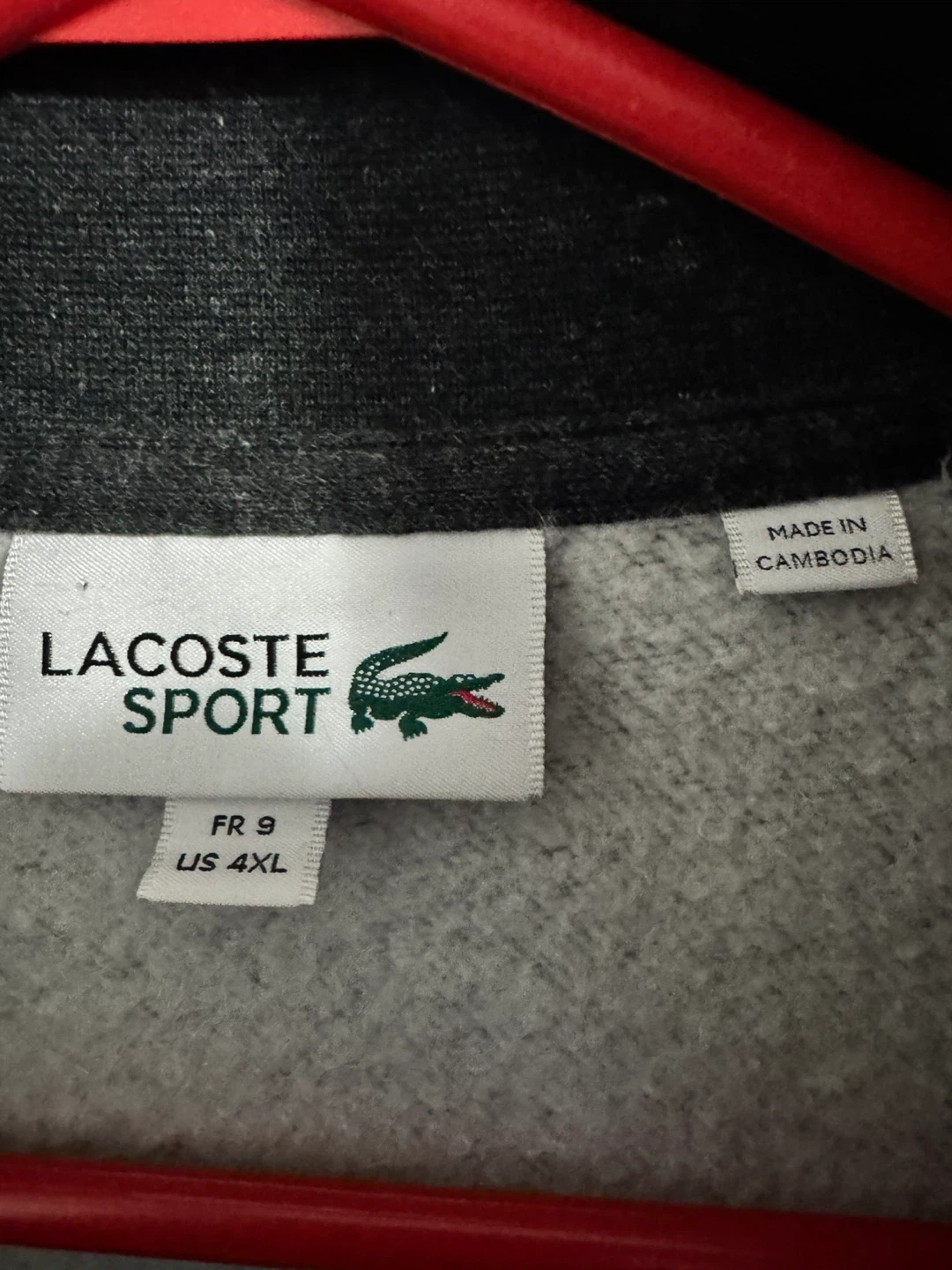 Here's a Lacoste Sport jacket in a dark gray colour. It's a size US 4XL and made in Cambodia. The material is 83% cotton and 17% polyester, making it a comfy and versatile jacket!