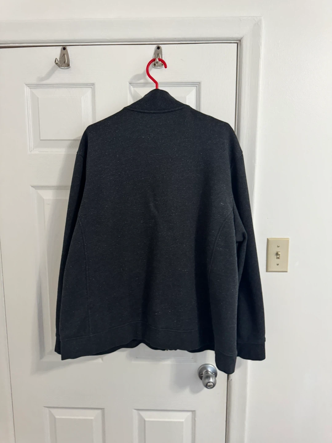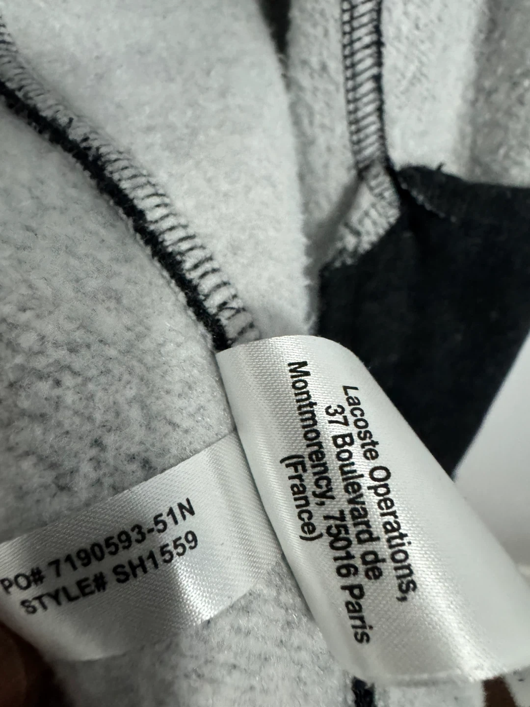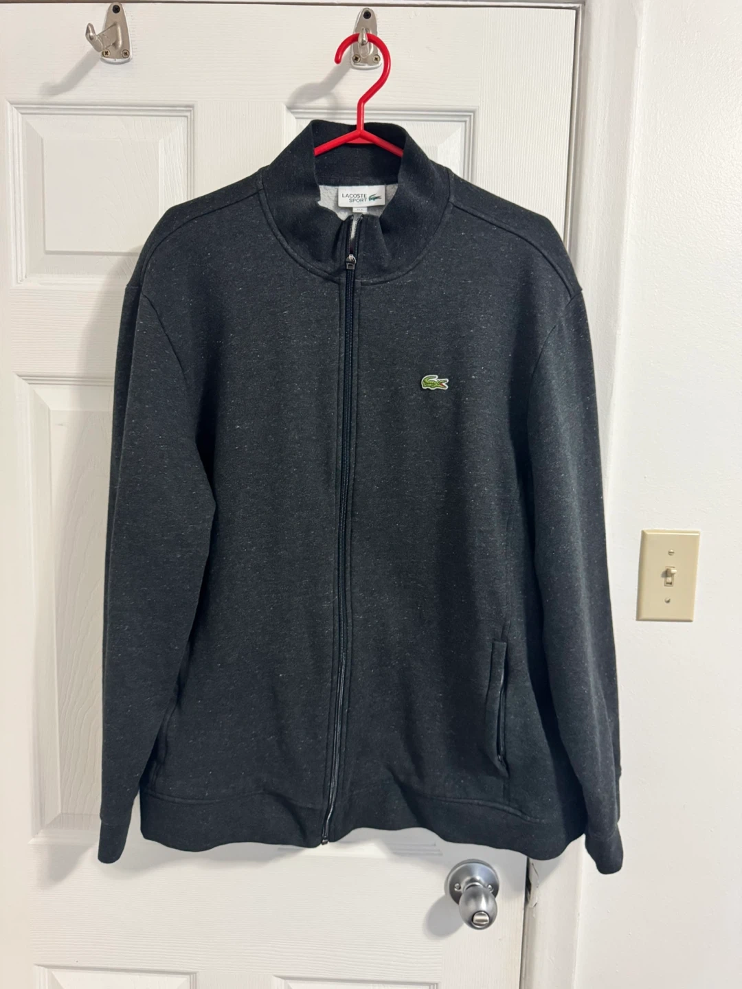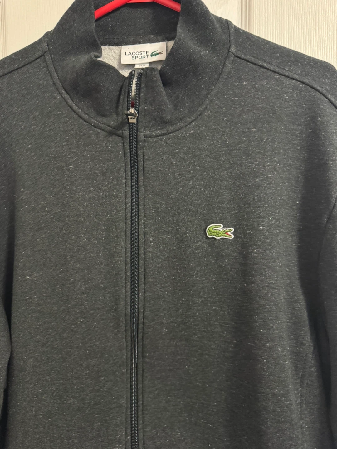 Here's a Lacoste Sport jacket in a dark gray colour. It's a size US 4XL and made in Cambodia. The material is 83% cotton and 17% polyester, making it a comfy and versatile jacket!