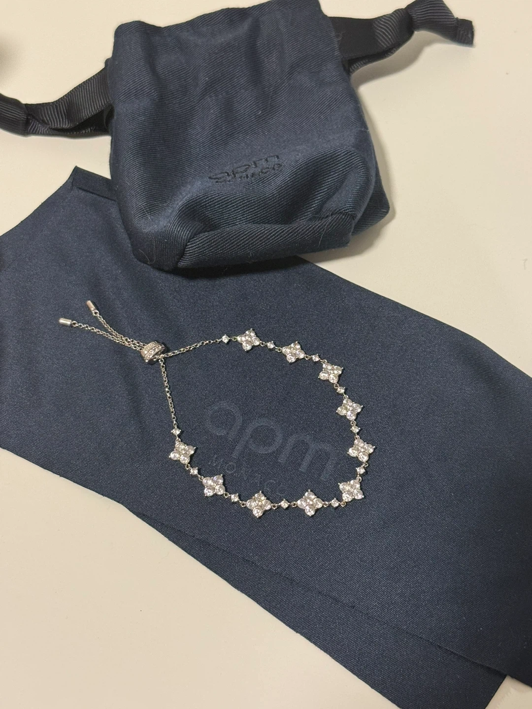 This is an APM Monaco bracelet featuring a delicate chain with multiple crystal-embellished clover motifs. It comes with its original dust bag and pouch for safekeeping. The adjustable slider clasp ensures a comfortable fit.