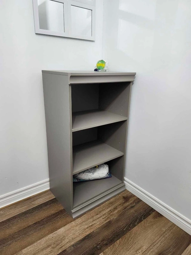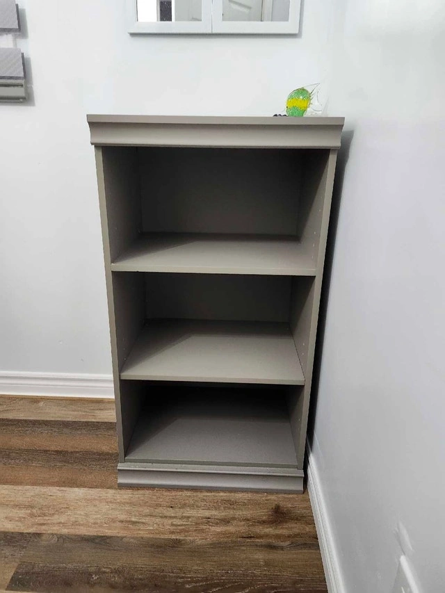 This grey bookshelf offers a practical storage solution with its three shelves, perfect for organizing books or displaying decor. This piece is in used condition, showing gentle signs of wear that add to its character, as seen in the photos. A great addition to any room needing a touch of organization. Please refer to the photos for a visual estimate of the bookshelf's size and style. If the ad is still posted, it's still available for purchase! Cash accepted.