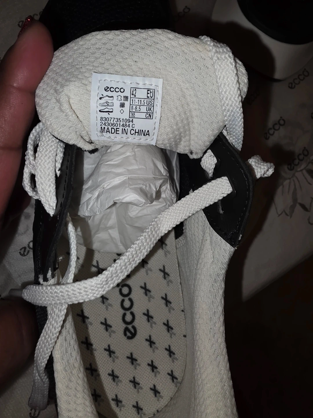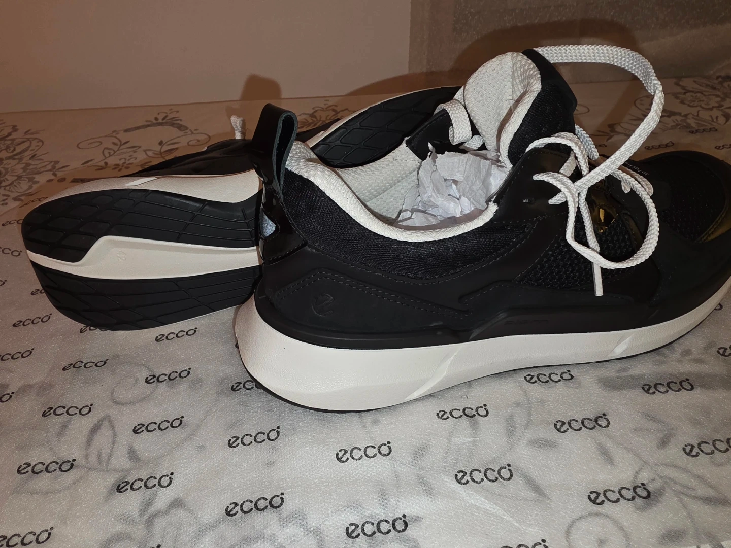 ECCO athletic shoes in black. They're a size EU 42, which is US 8-8.5 and UK 7.5. These shoes are made in China.