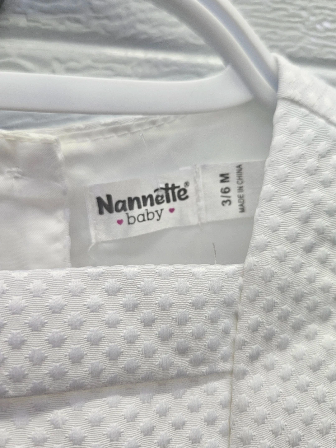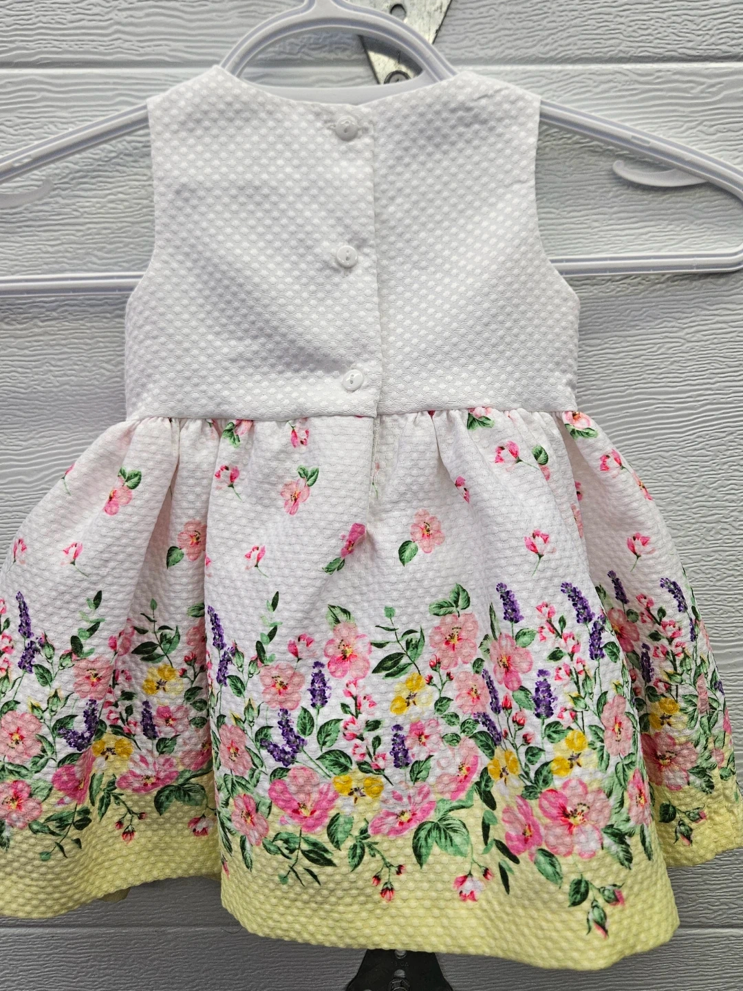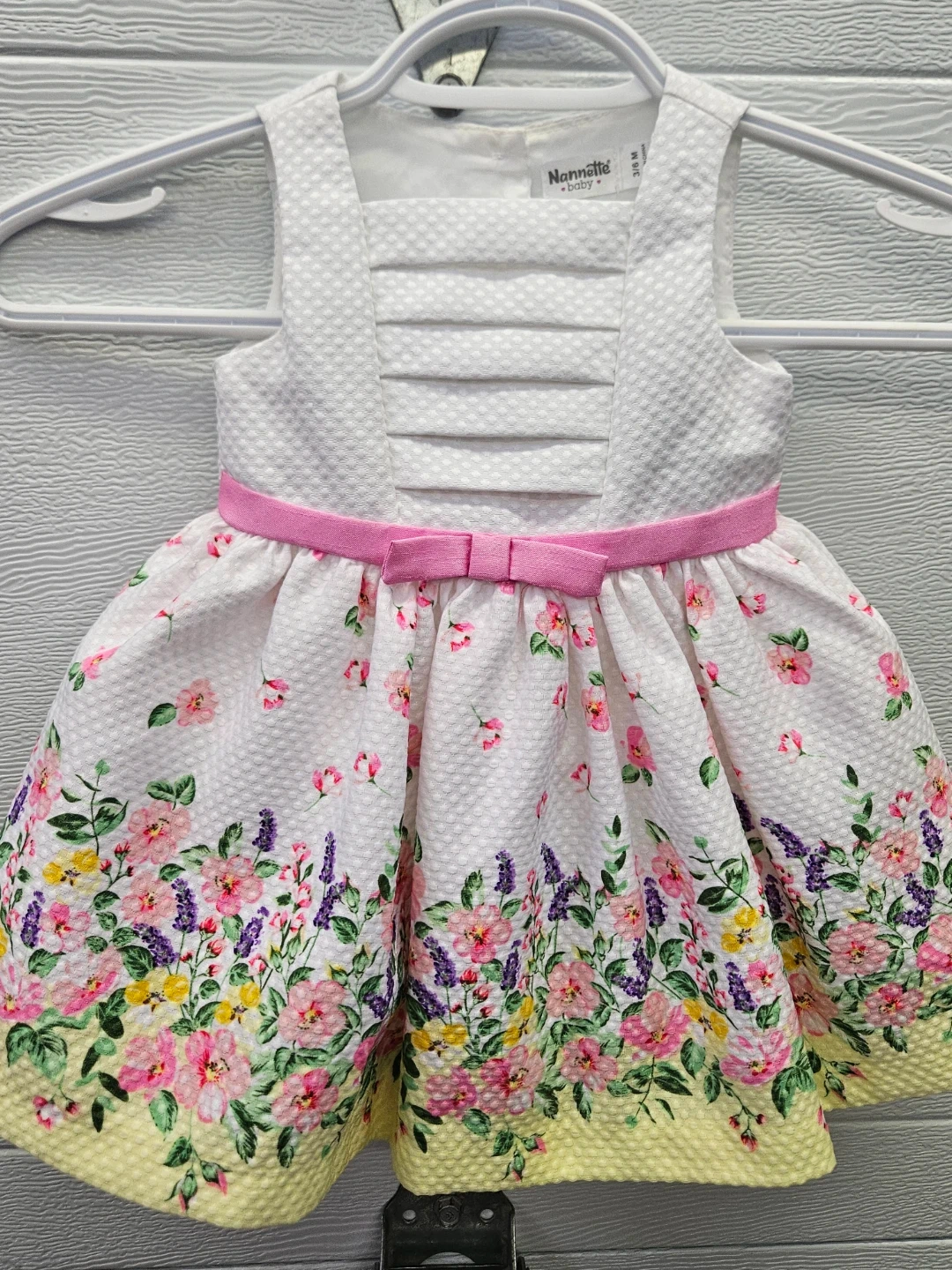 White Nannette baby dress with a floral print skirt and a pink bow accent. Size is 3/6 months. It's sleeveless with a textured bodice. Perfect for a little one's spring or summer events!