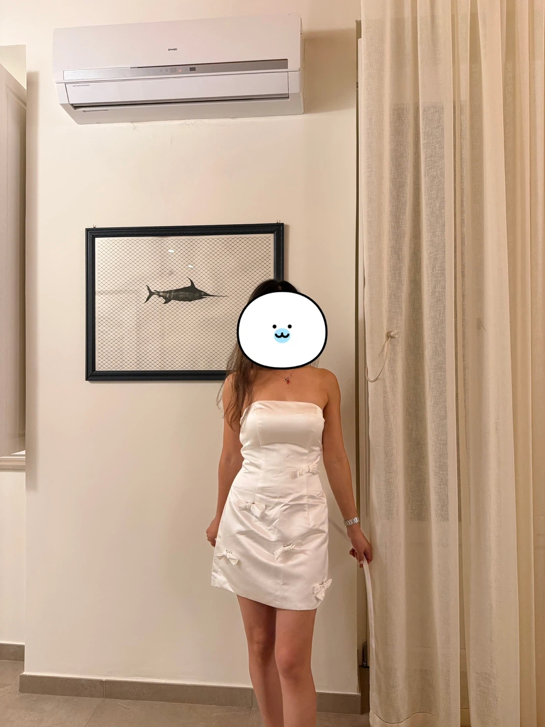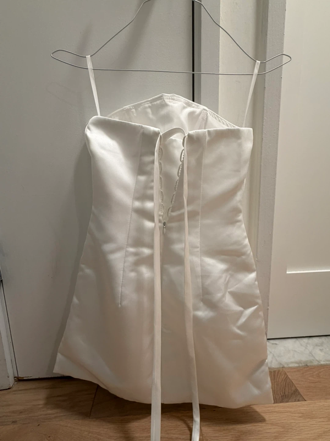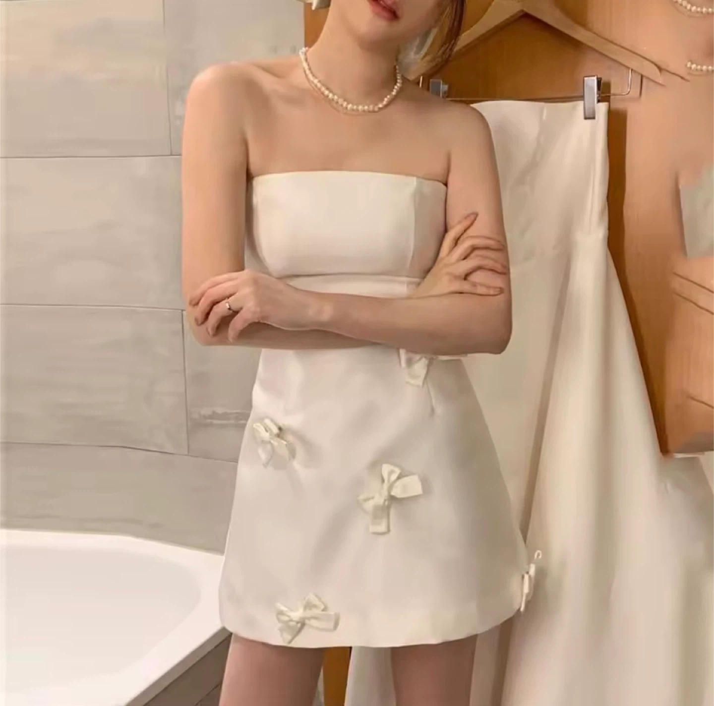 Selling a cute white strapless mini dress! It features adorable bow accents which is detachable and a corset-style back. Perfect for a party or special occasion.