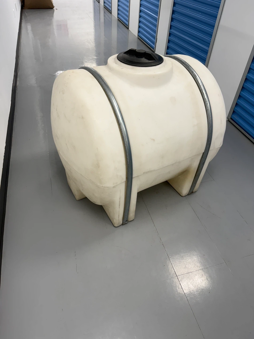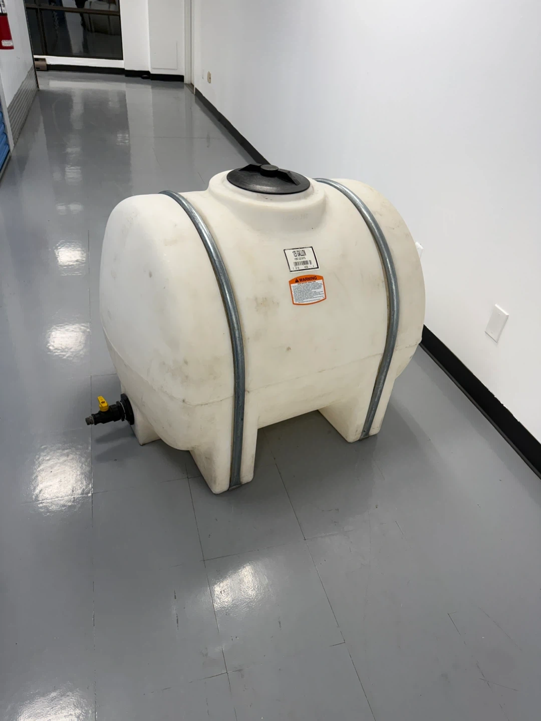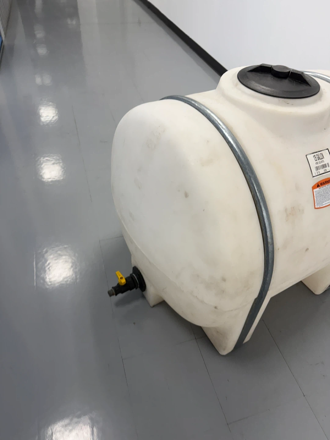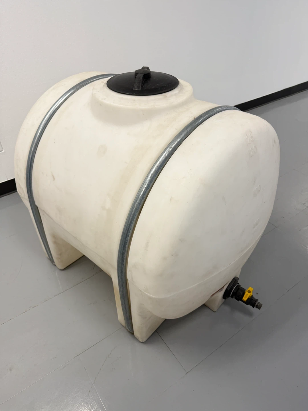 This is a 125-gallon white polyethylene water tank. It has metal banding for support and a spigot for dispensing. It's great for storing water for your garden or other outdoor needs.