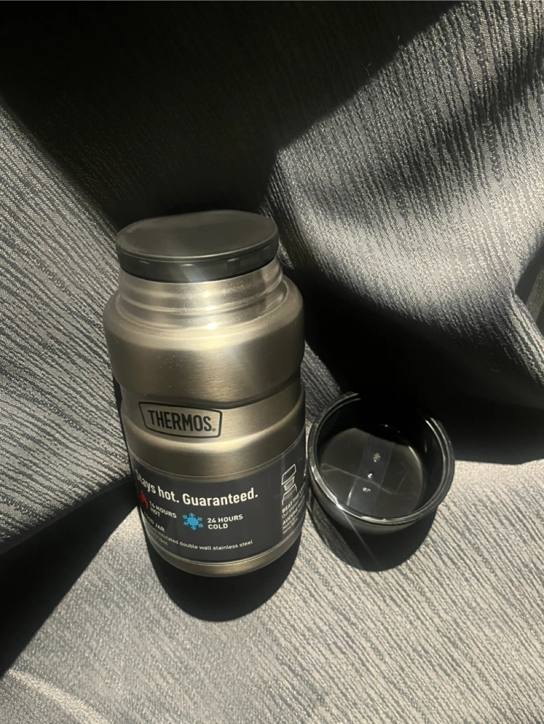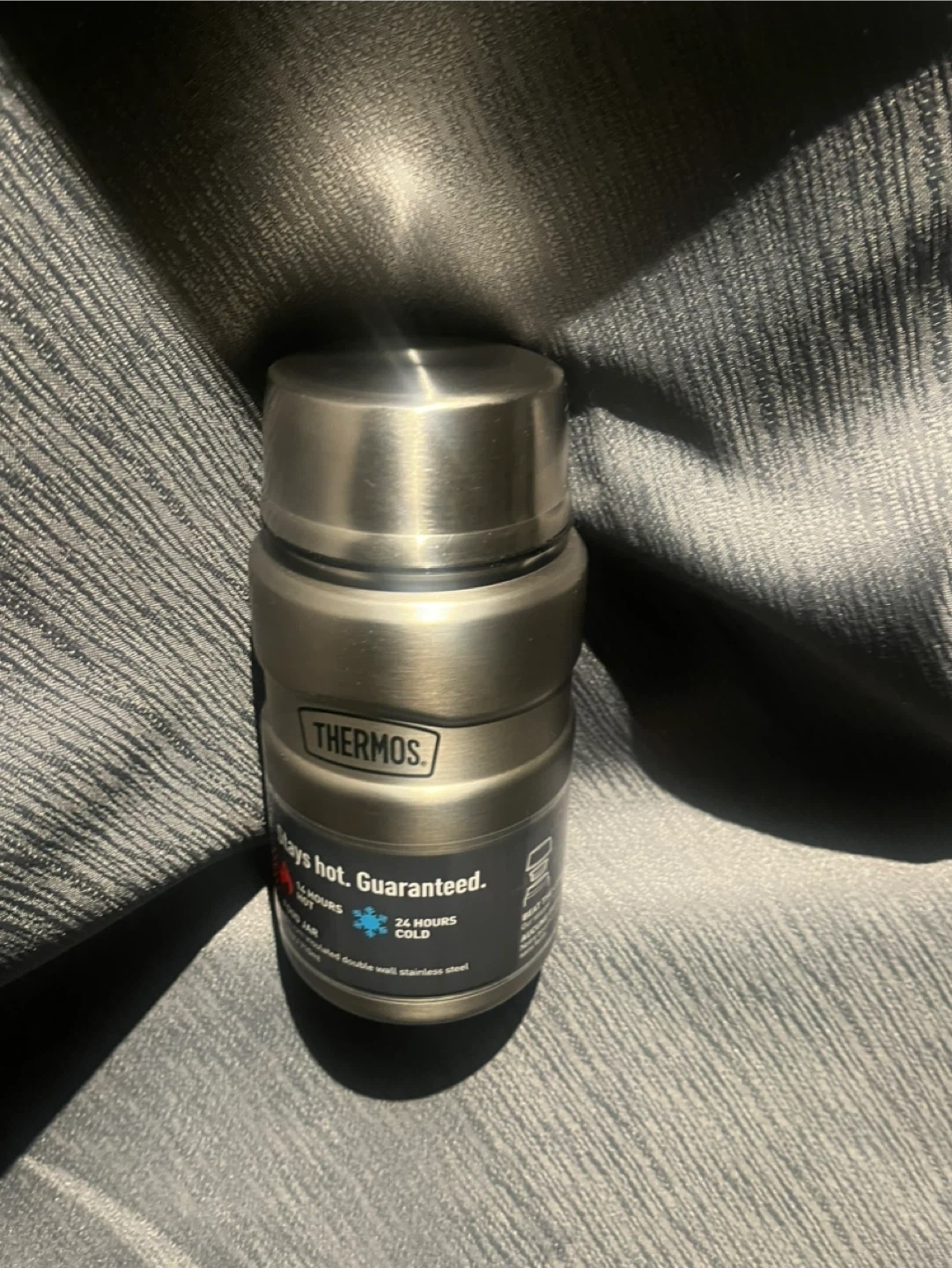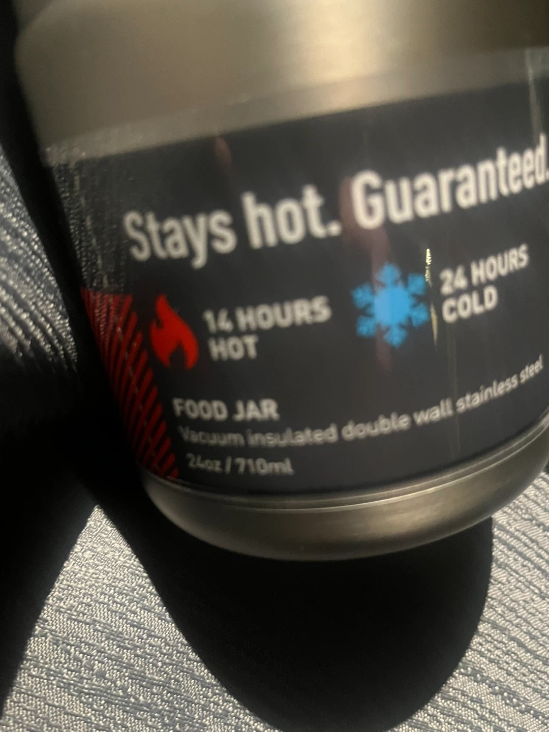 This Thermos food jar is vacuum insulated and made of double-wall stainless steel. It keeps food hot for 14 hours and cold for 24 hours. The capacity is 24oz or 710ml.