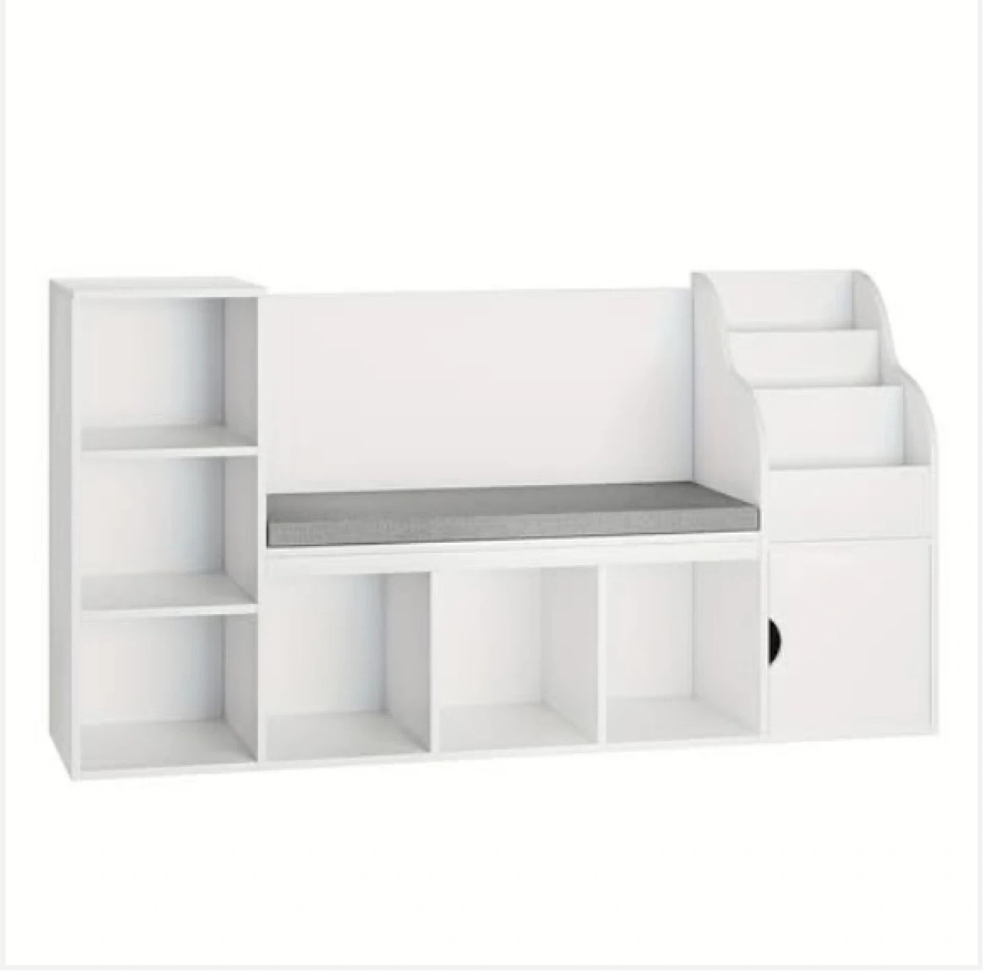 This white storage bench offers multiple compartments for organization. It features open shelves on one side with a cushioned seat on top. The stepped shelf unit adds extra storage and display space.