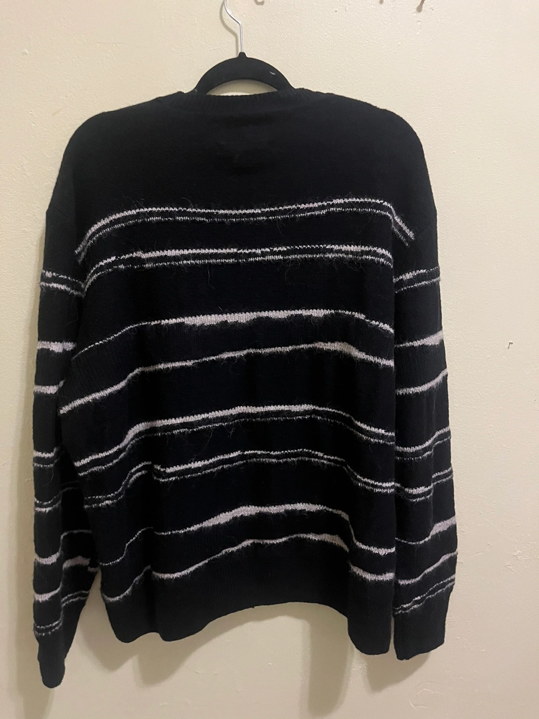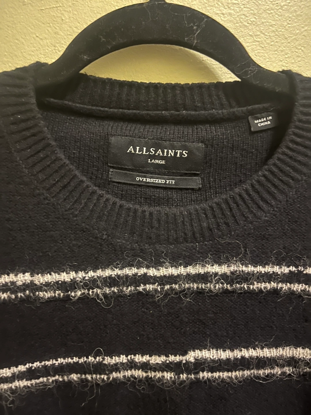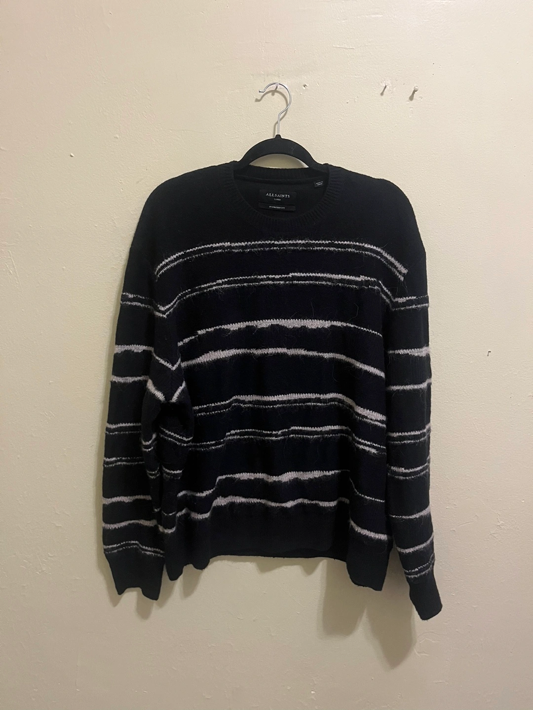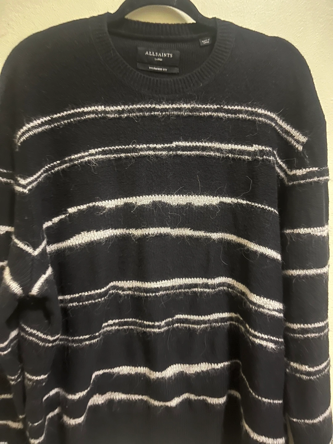 All saints men’s fuzzy sweater size large excellent condition, not random white hair it came like that bc of the stripes, it’s part of the sweater