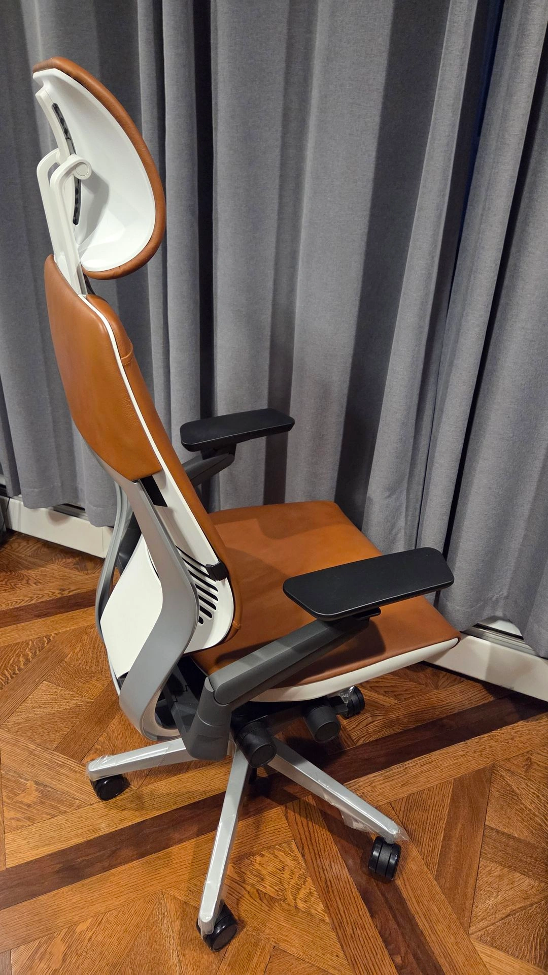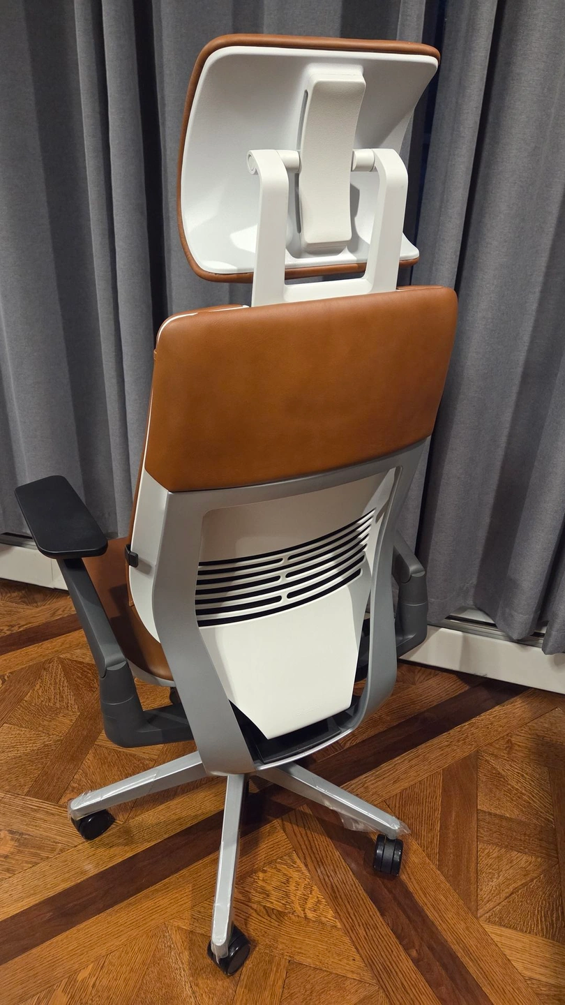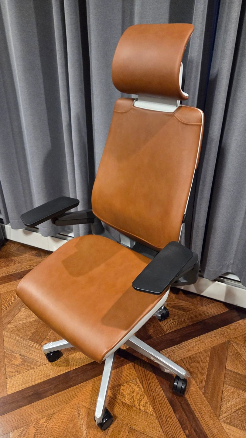 Like new, still has plastic on the legs. Genuine leather with headrest and lumbar support. Costs over $2300 from Steelcase with these options. Frame: Platinum Metallic Frame with Seagull Seat/Back, Merle arms (Light/Light). Upholstery: Café Leather - Chai.
