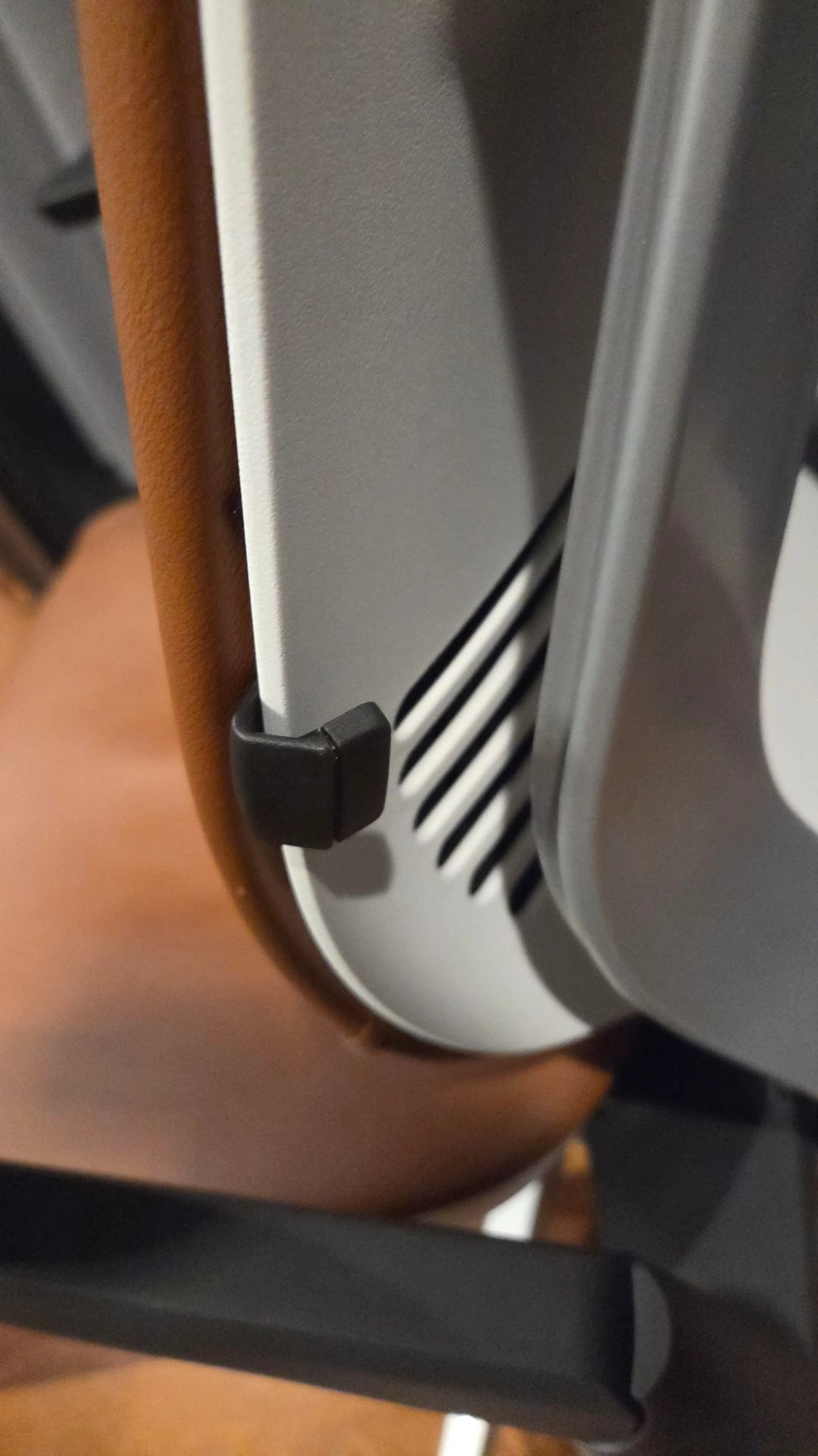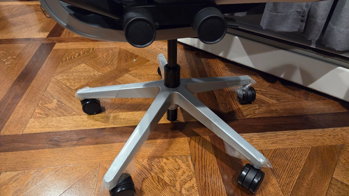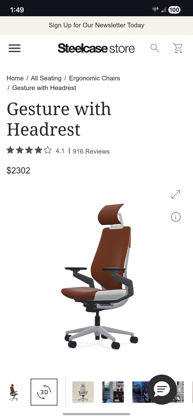 Like new, still has plastic on the legs. Genuine leather with headrest and lumbar support. Costs over $2300 from Steelcase with these options. Frame: Platinum Metallic Frame with Seagull Seat/Back, Merle arms (Light/Light). Upholstery: Café Leather - Chai.