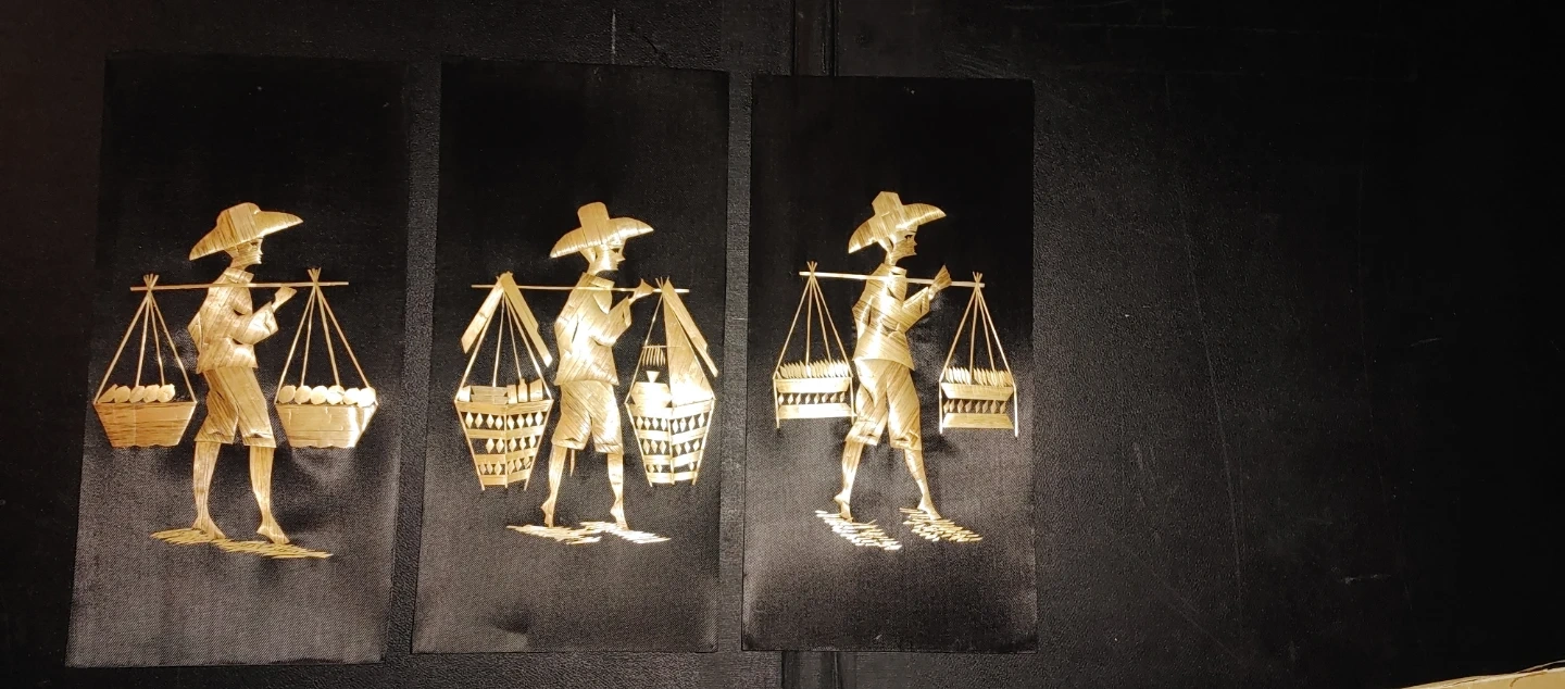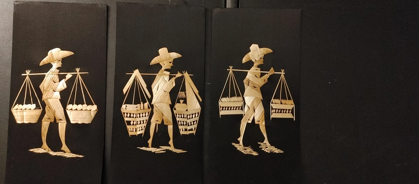 This unique triptych wall hanging features detailed straw art of figures carrying baskets. It's a lovely decorative piece for any room. The natural straw provides a warm, textured look.