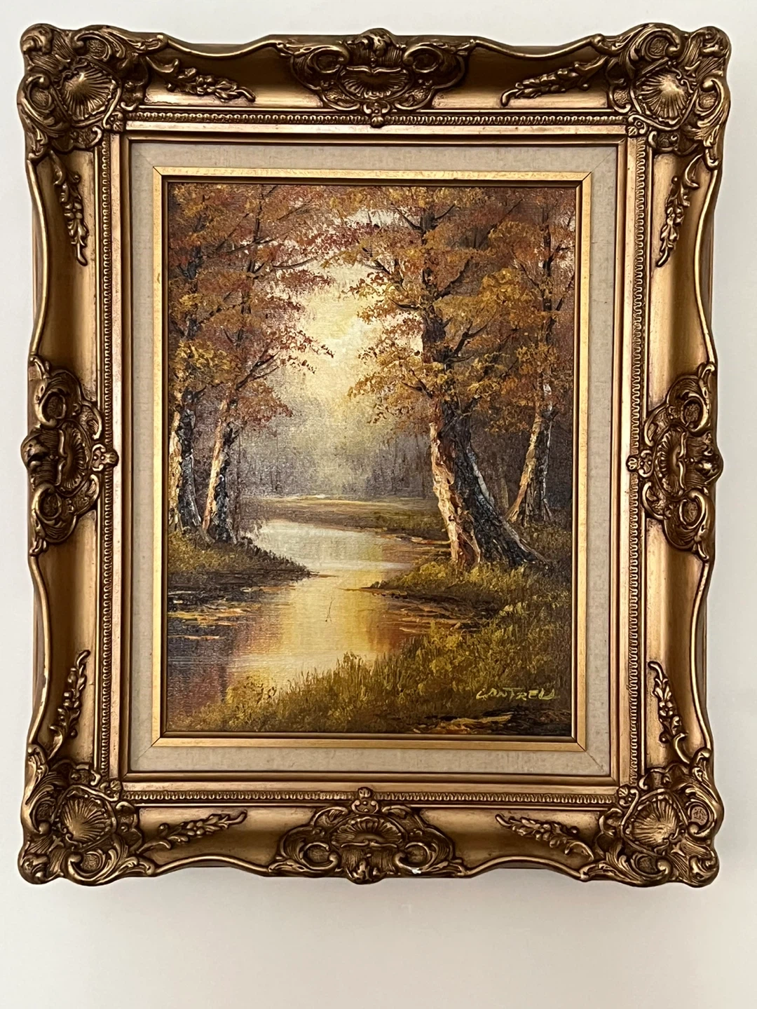 Beautiful original landscape oil painting featuring a serene river scene with autumn trees. It's framed in a decorative, ornate gold-coloured frame. This piece adds a warm, rustic touch to any room!