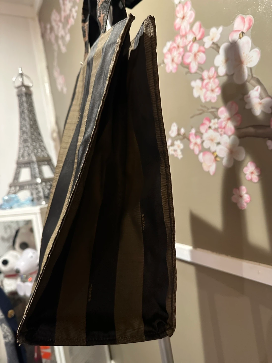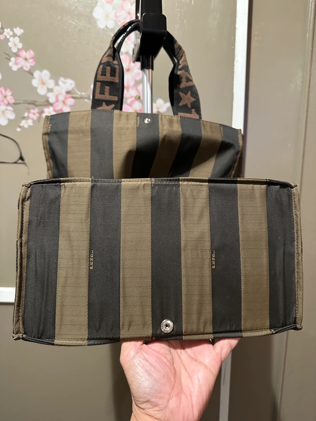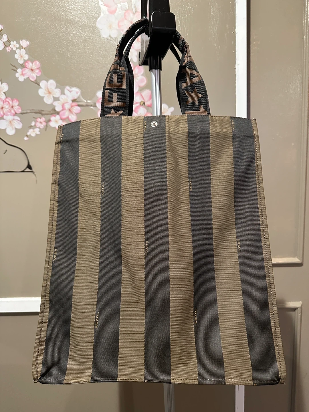 This is a Fendi tote bag with the signature striped pattern. Made in Italy. It's a stylish accessory for everyday use.