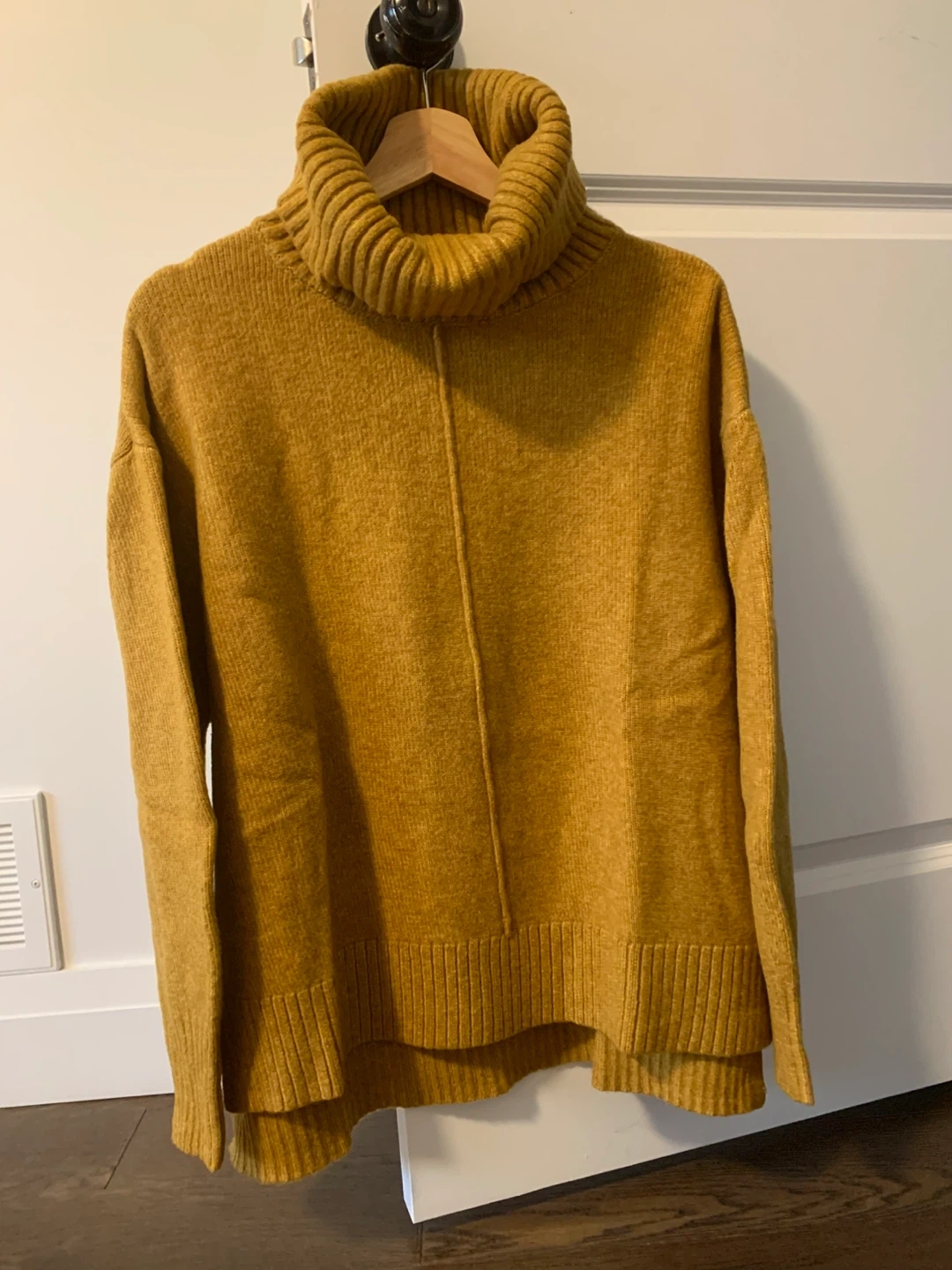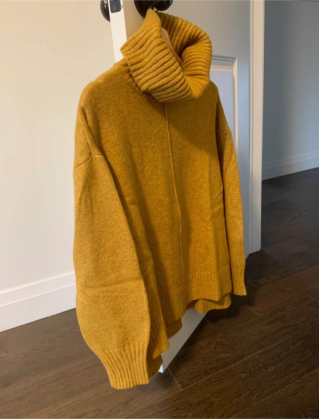 Cozy mustard yellow turtleneck sweater. It's a comfortable knit with a ribbed collar, cuffs, and hem. Looks great for cooler weather!