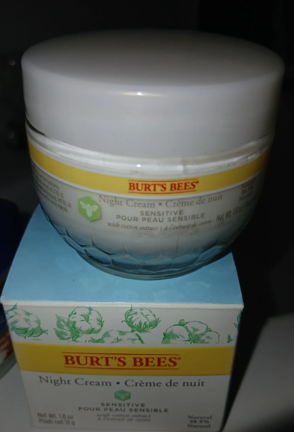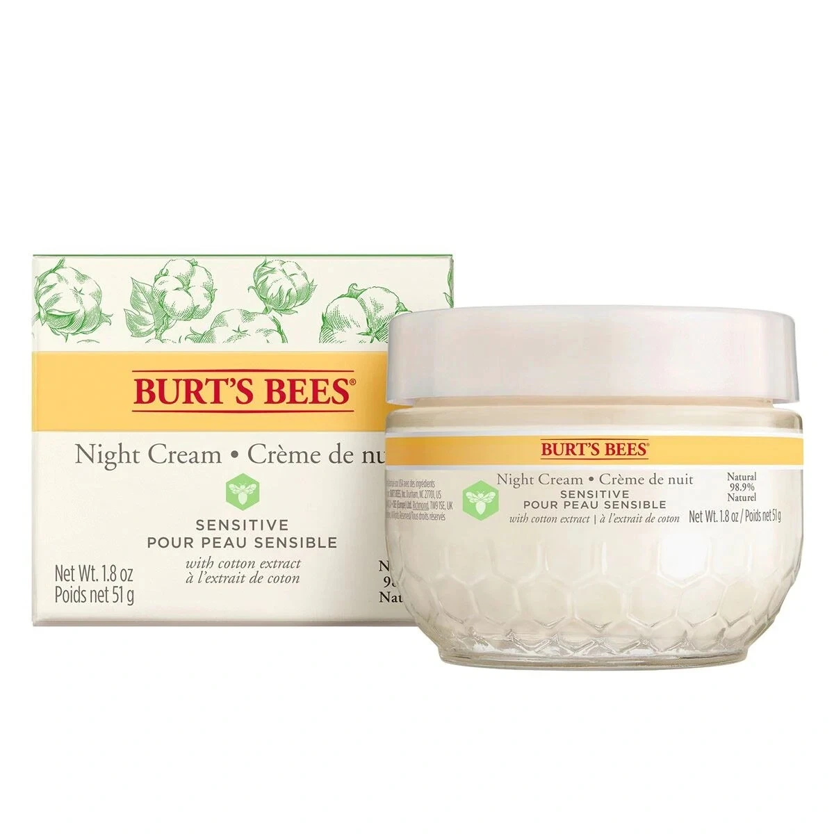 Burt's Bees Sensitive Night Cream helps soothe and moisturize your skin overnight. It's formulated with cotton extract for sensitive skin. Net Wt. 1.8 oz (51g).