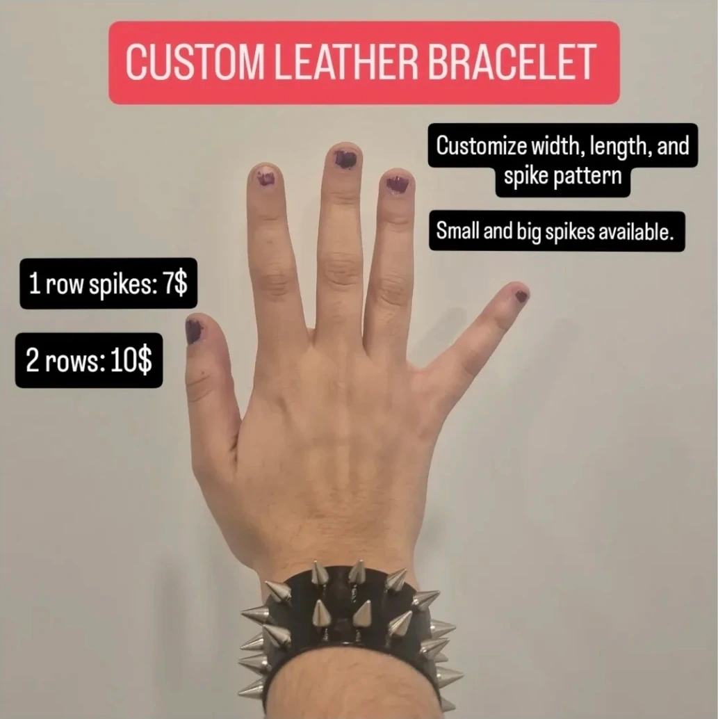 Get your own custom leather bracelet! You can customize the width, length, and pattern of the spikes. Small and big spikes are available.