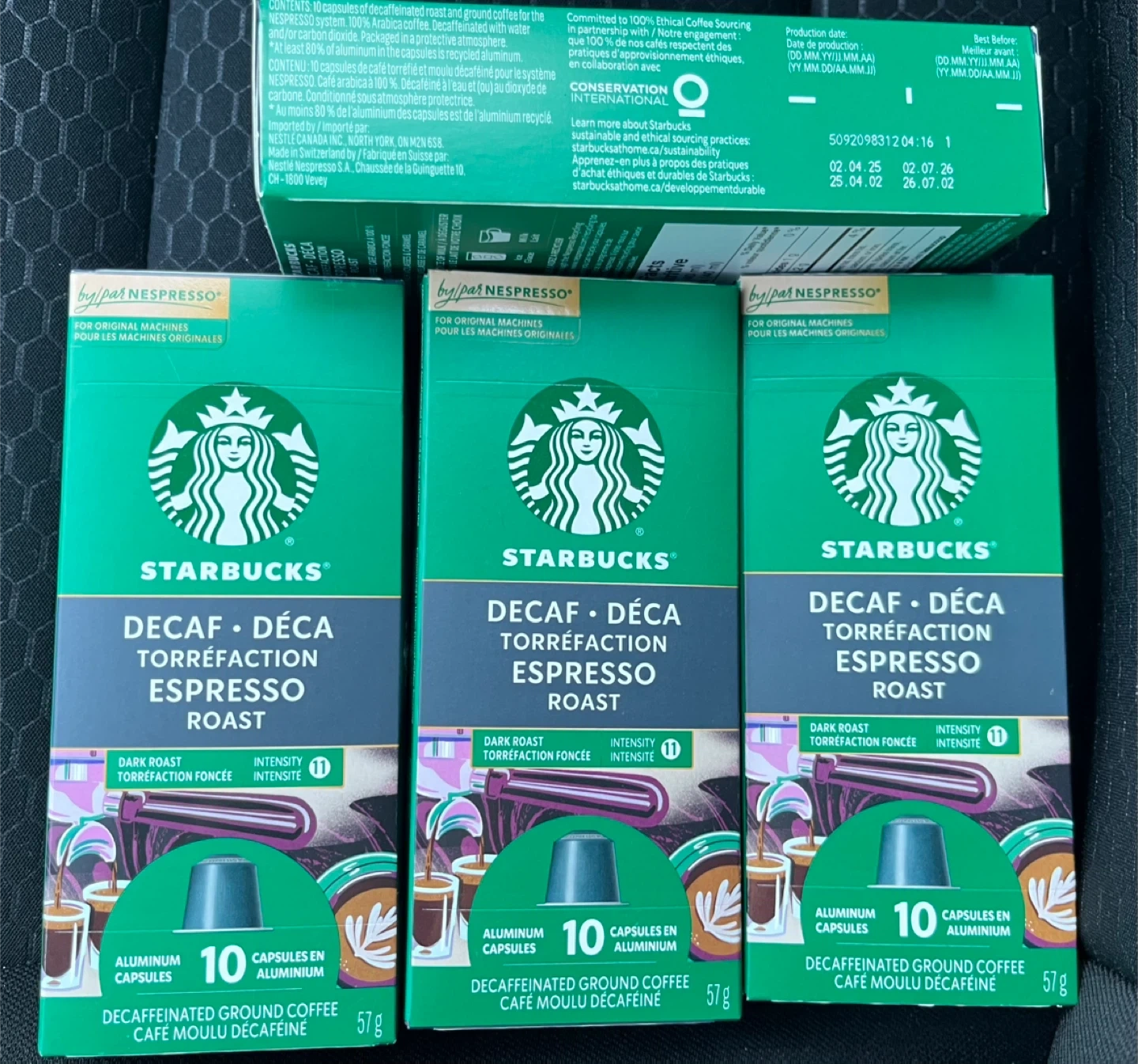 4 boxes of Starbucks Decaf Espresso Roast coffee capsules for Original Nespresso machines. Each box contains 10 aluminum capsules with decaffeinated ground coffee. These are dark roast with an intensity of 11.