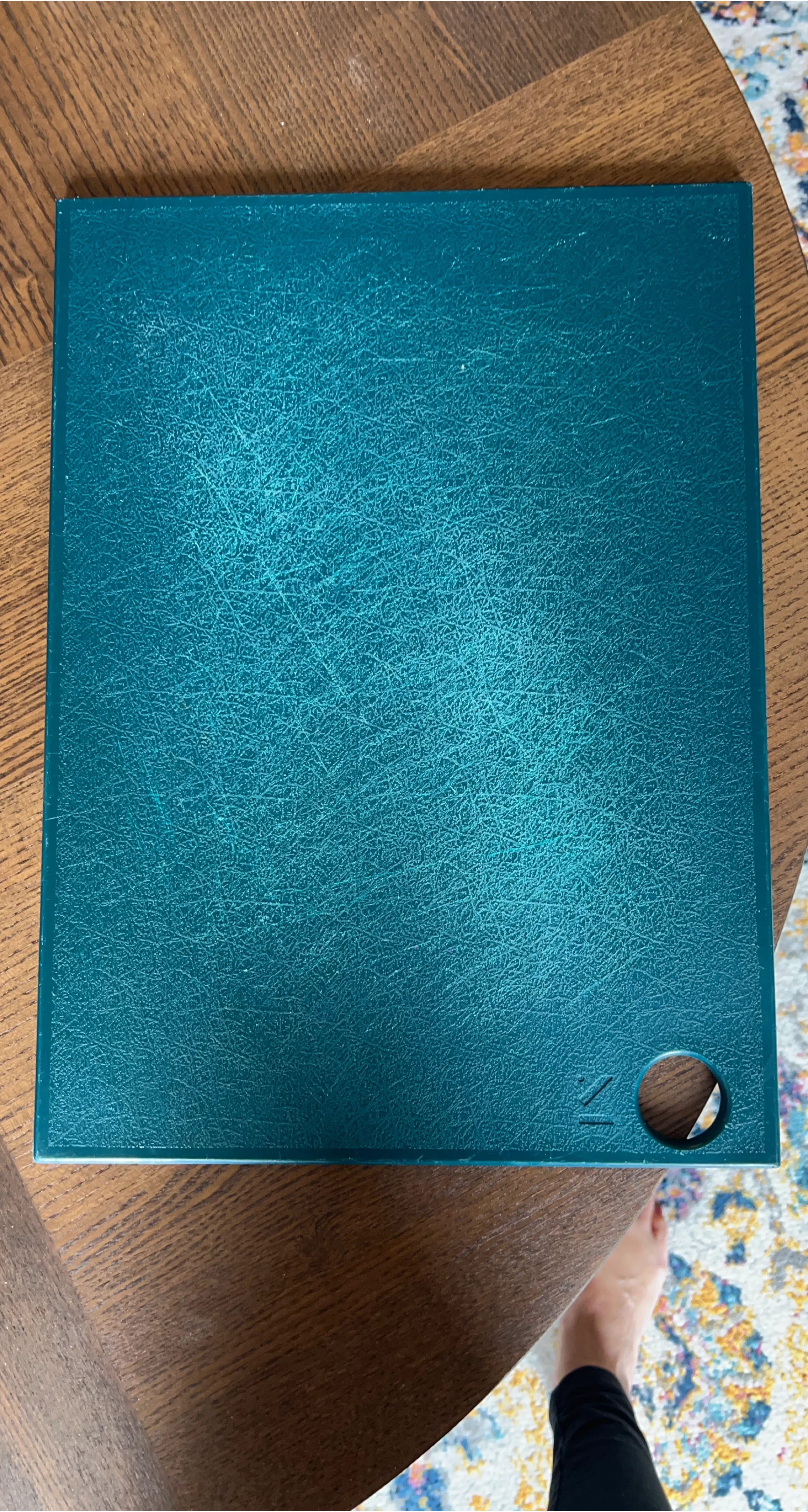 This is a teal cutting board. It's made of plastic and has a textured surface. There's a hole for hanging it up. It's a useful kitchen tool!