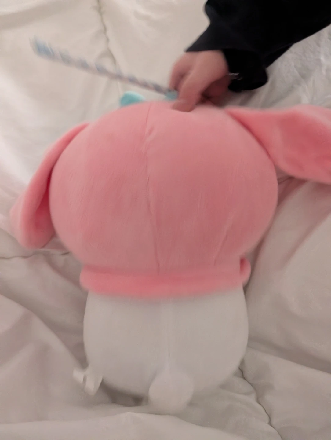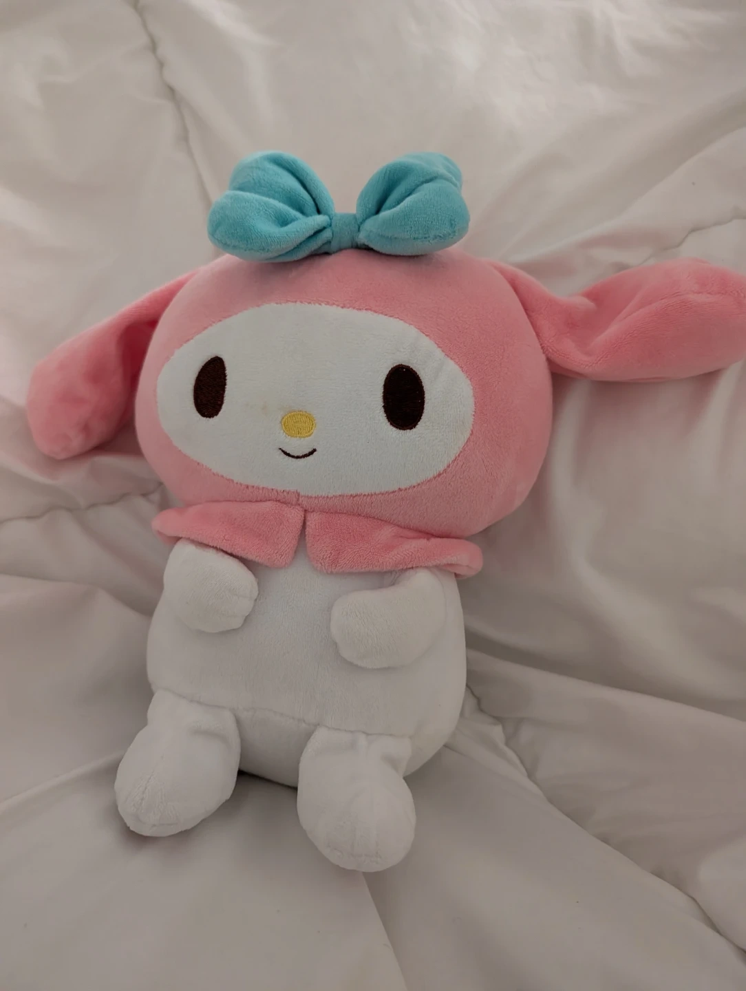 This is a soft plush toy featuring the Sanrio character My Melody. It's pink and white with a blue bow. This cuddly toy is perfect for fans of Sanrio characters!