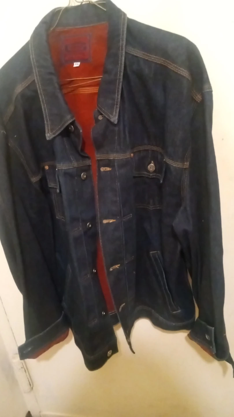 Classic dark wash denim jacket. Features a contrasting red lining and standard button-up closure. Includes two chest pockets and side pockets. Size is XX.