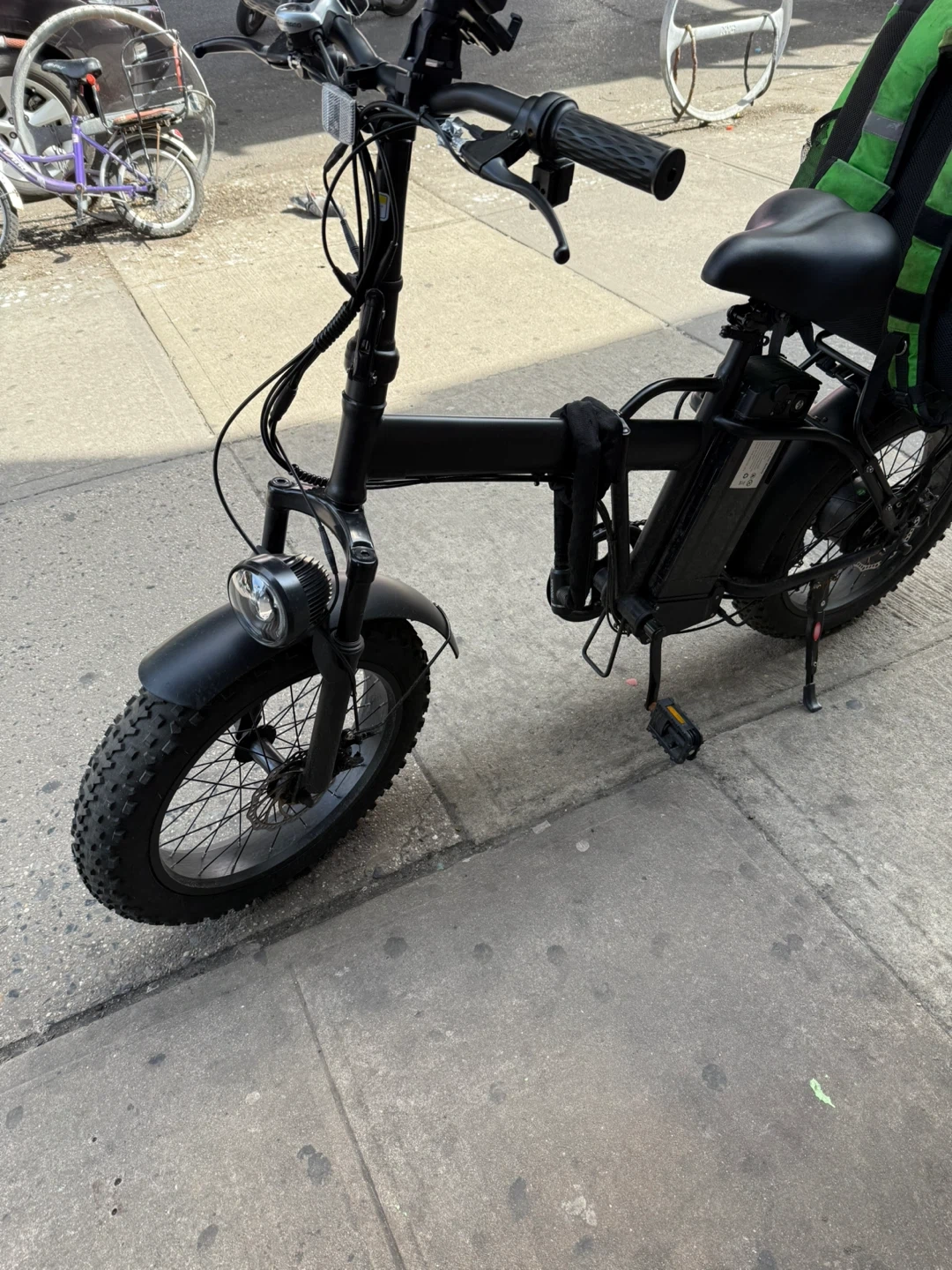 Black folding electric bike with fat tires. It has a built-in battery pack and a front headlight.