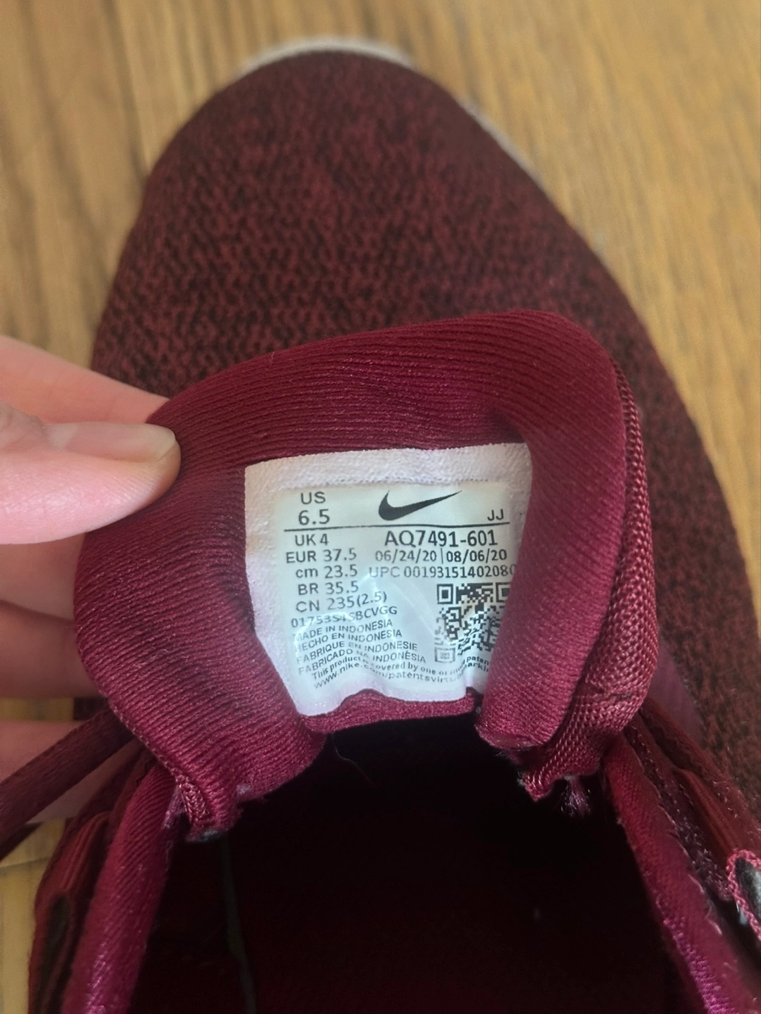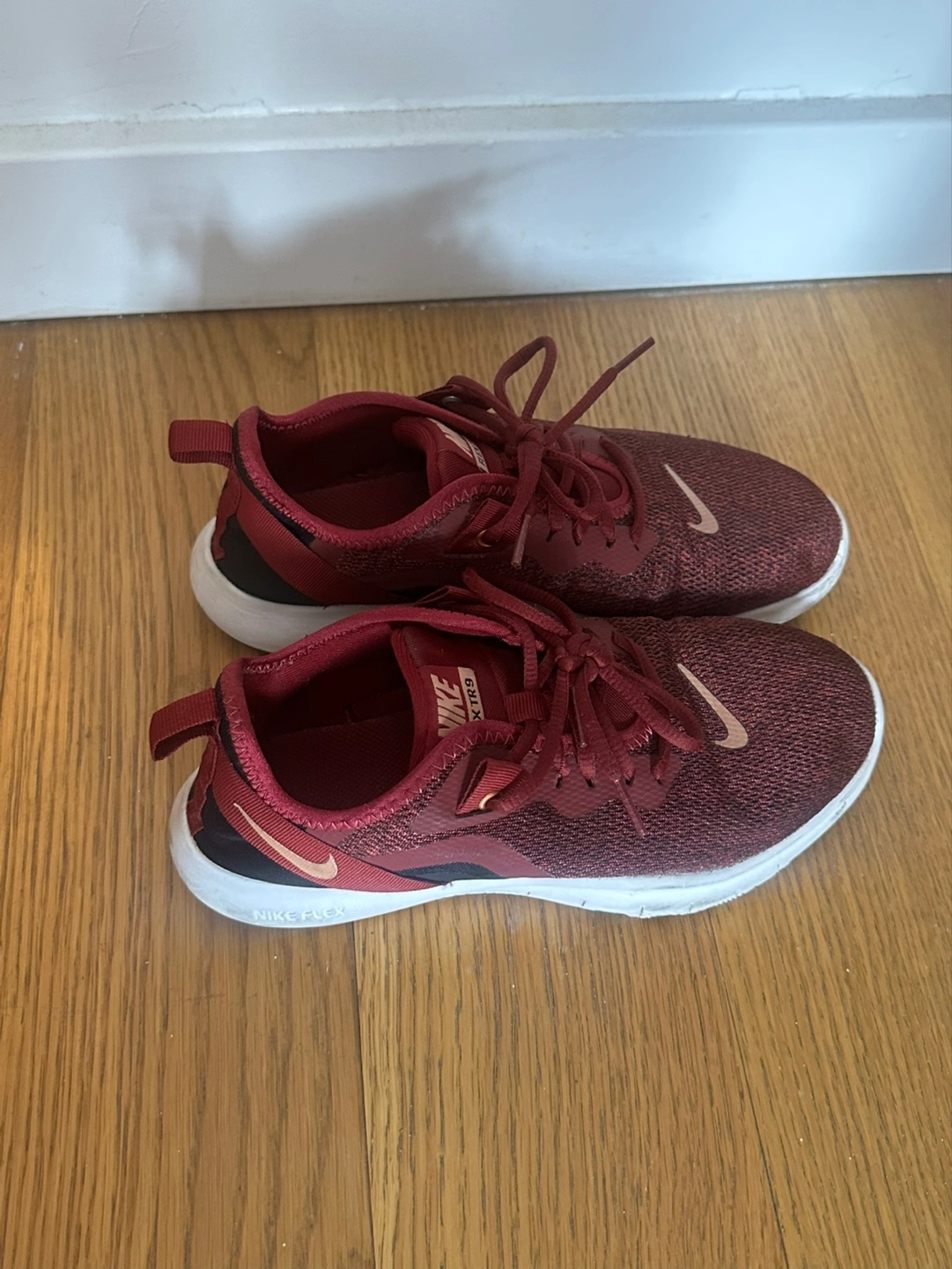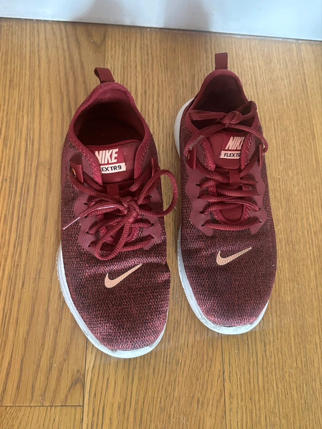 Women's Nike Flex TR9 running shoes. Size 6.5 US. Dark red knit fabric upper. White sole. Lightly used. Good condition.