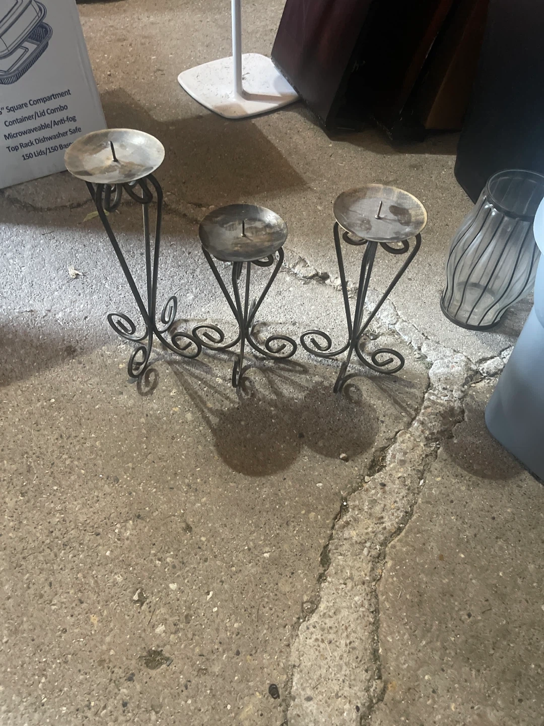 This is a set of three black metal taper candle holders with ornate scroll bases. They're designed to hold standard taper candles. A lovely addition to any table setting or mantelpiece!