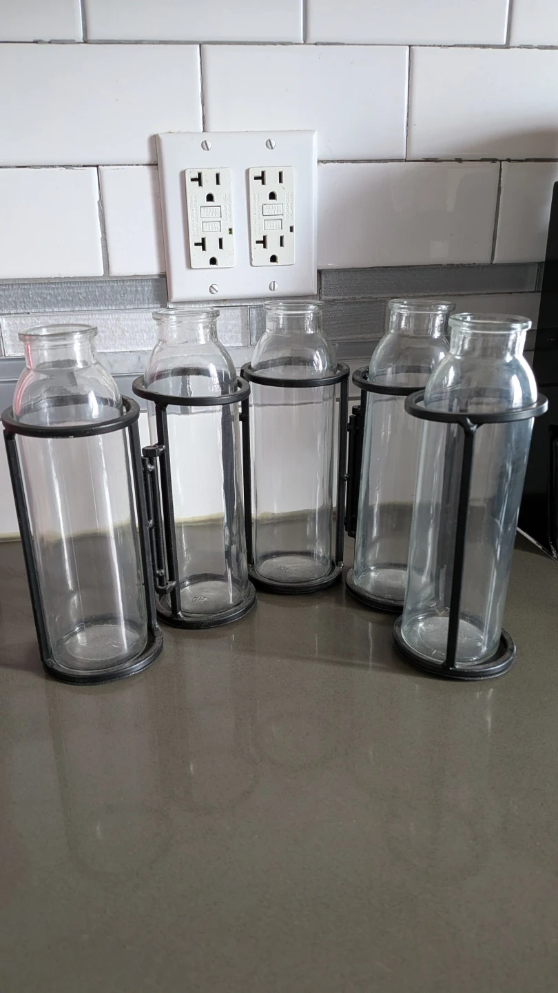 This set includes five clear glass bottles, each housed in a dark metal caddy. They're perfect for displaying small flowers or as decorative accents. Glass material. Adds a touch of rustic charm to any space!