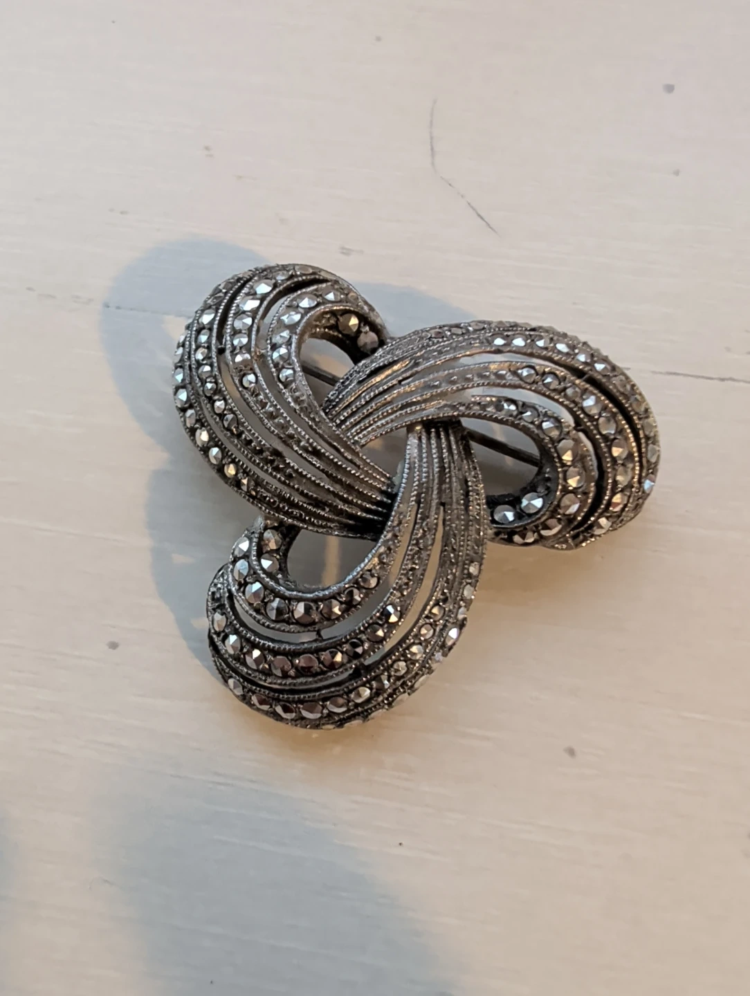 This beautiful brooch showcases a swirling, interlinked design reminiscent of an infinity symbol. It's adorned with numerous small, sparkling stones that mimic the look of marcasite. The pin closure is secure and functions well.
