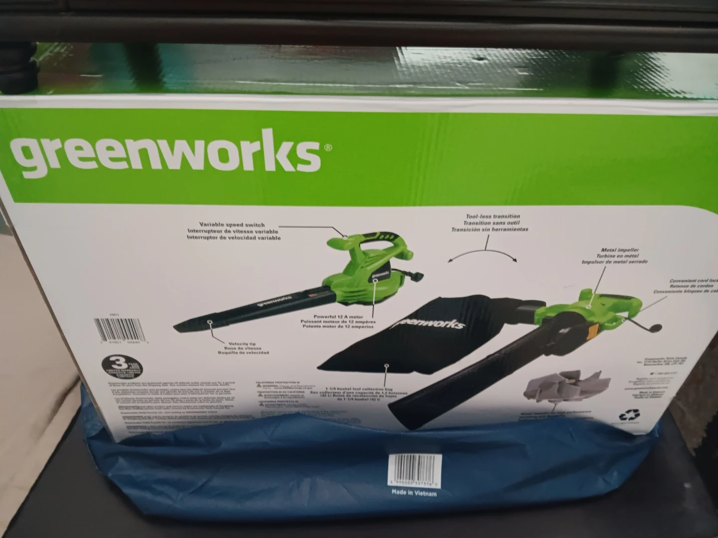 Greenworks 12 Amp electric leaf blower. It features a variable speed switch for controlled airflow and a tool-less transition design. Includes a 1-1/4 bushel leaf collection bag. Made in Vietnam.