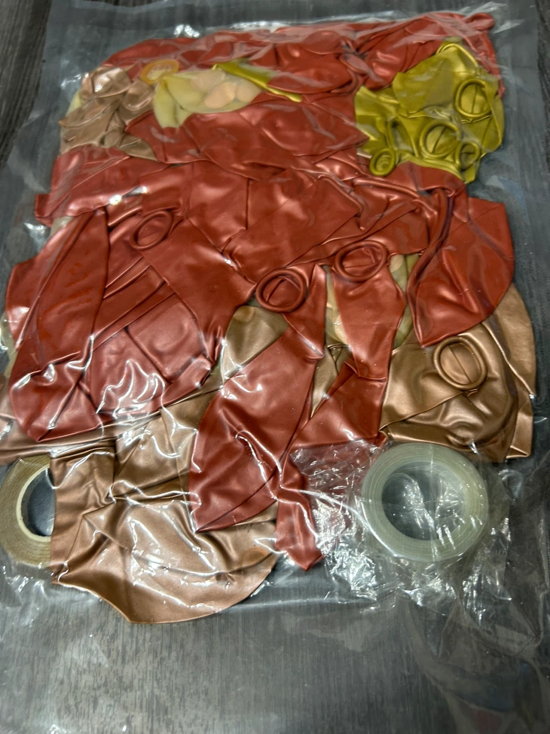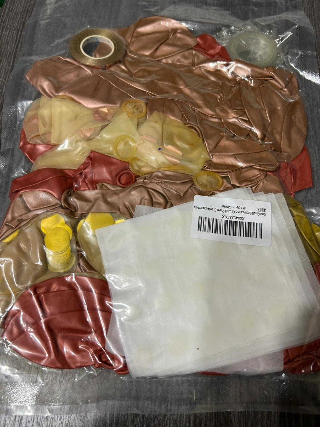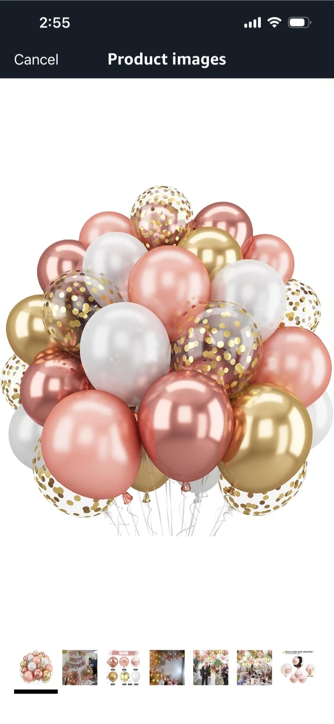 This is a balloons perfect for a first birthday celebration. It includes rose gold, gold, and white balloons, some with confetti. The balloons are 12 inches.