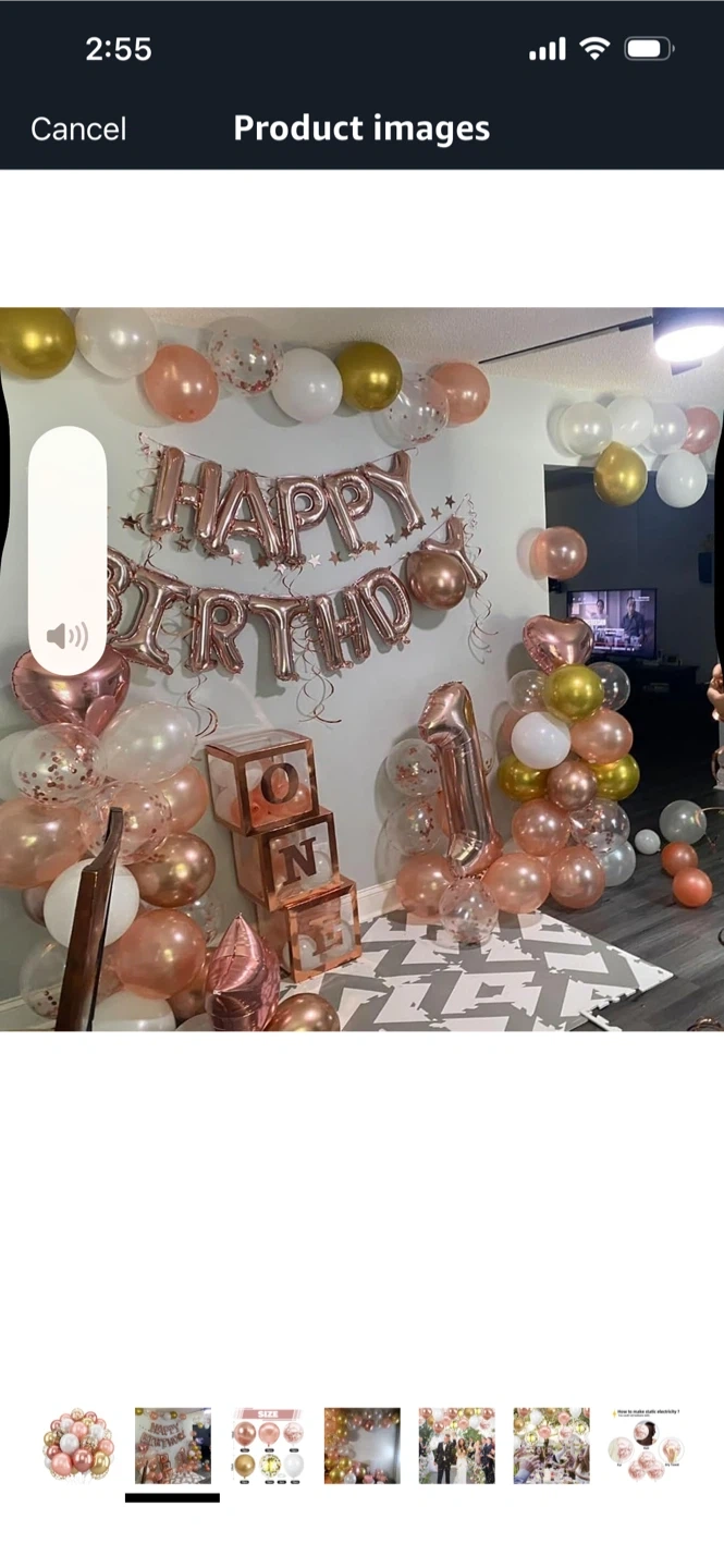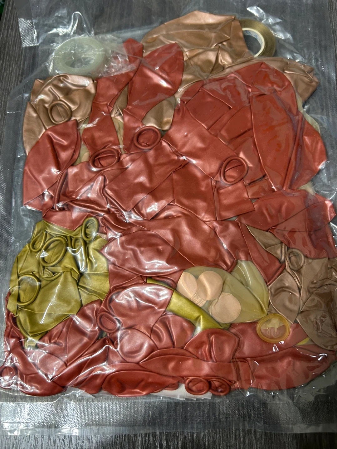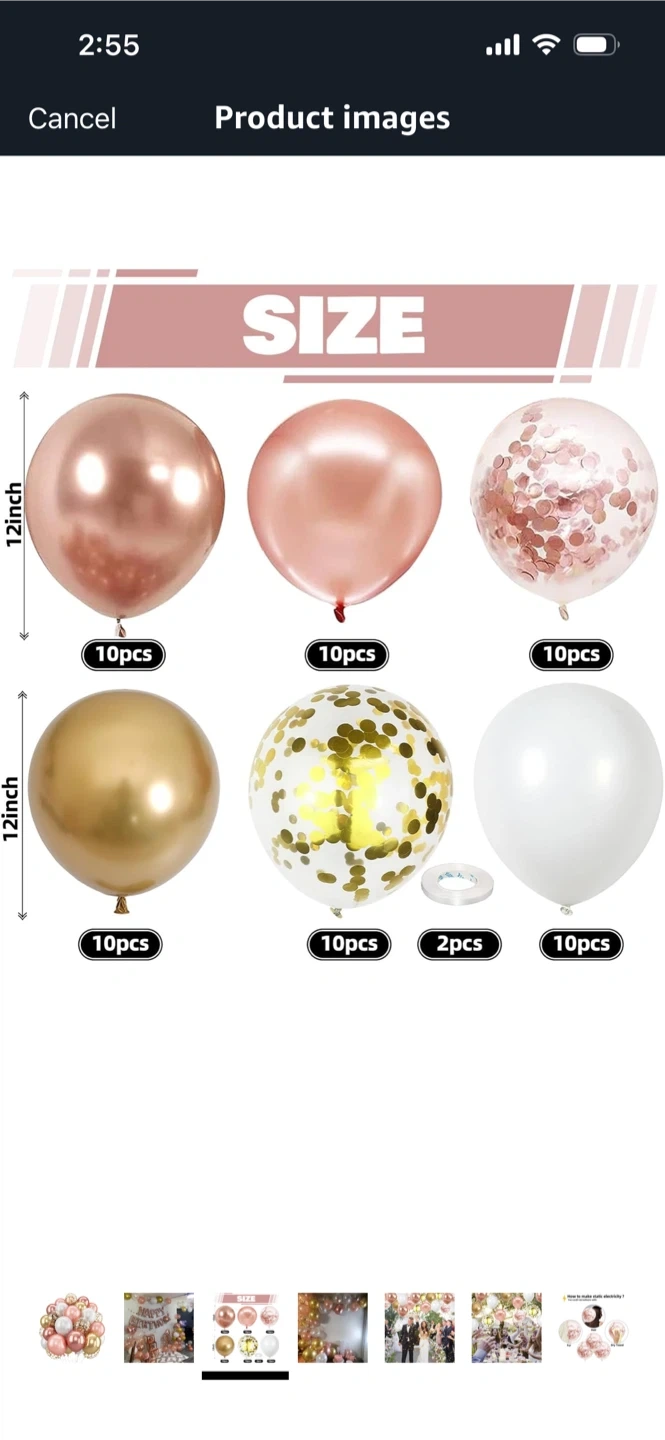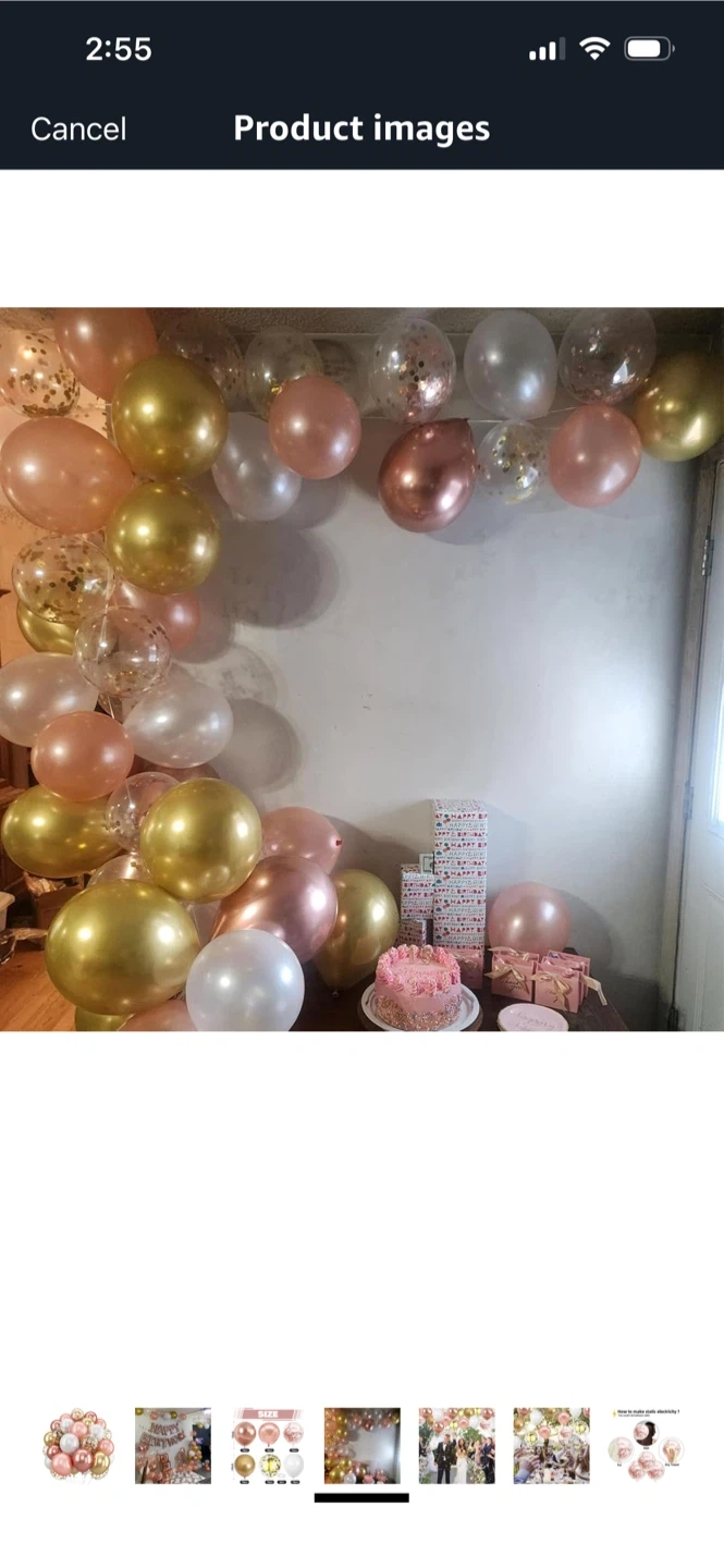 This is a balloons perfect for a first birthday celebration. It includes rose gold, gold, and white balloons, some with confetti. The balloons are 12 inches.