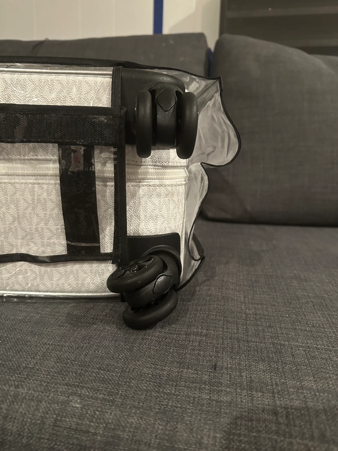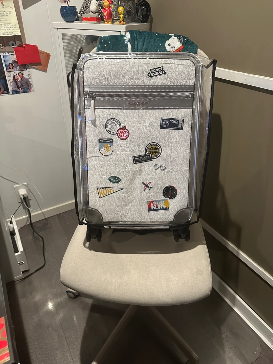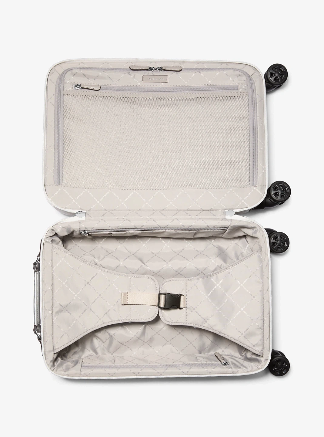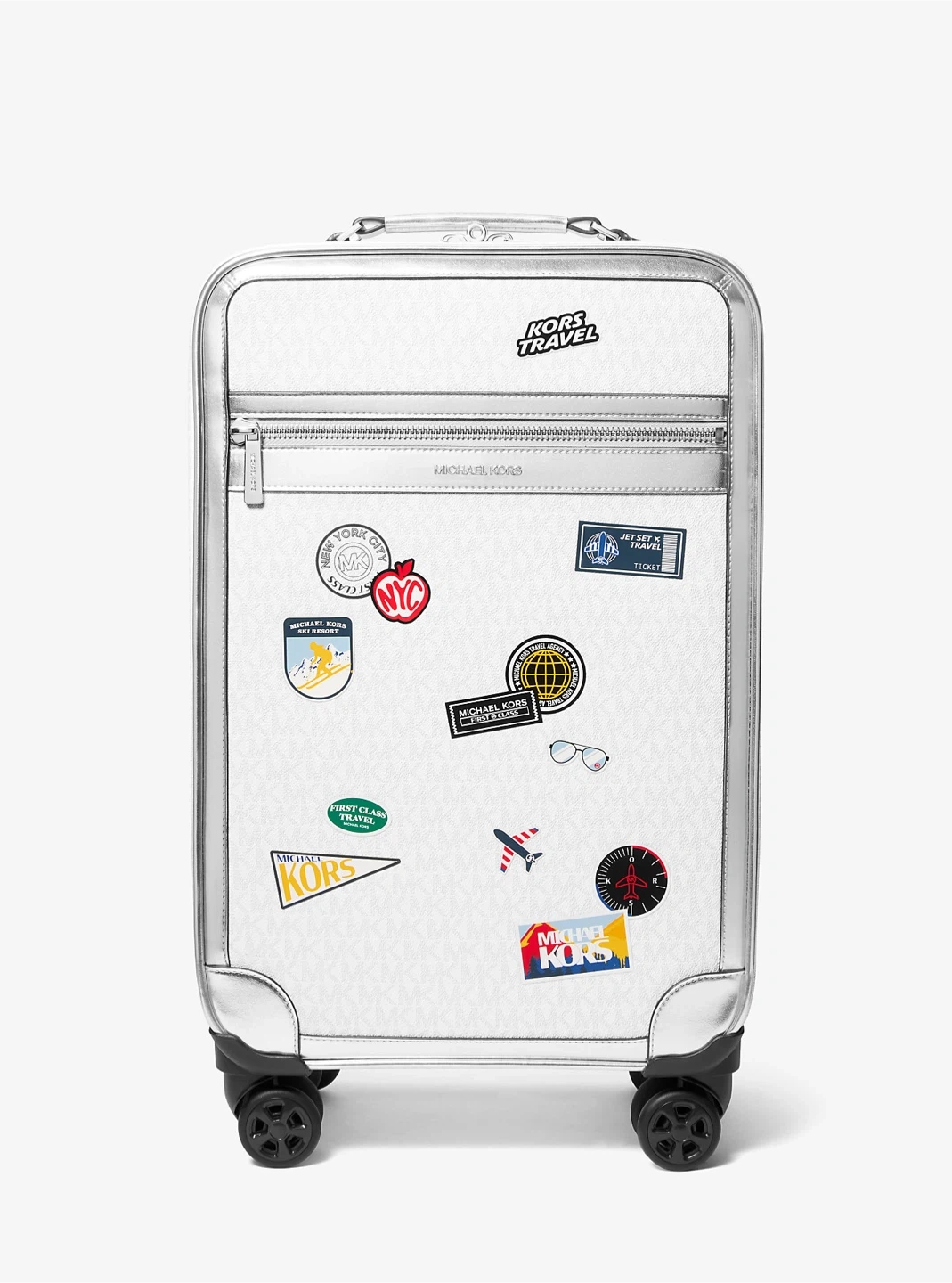 This Michael Kors carry-on suitcase is perfect for your next trip! It features the signature MK logo print and playful travel stickers. The interior is lined and includes compression straps to keep your belongings secure. Spinner wheels make it easy to manoeuvre through the airport.