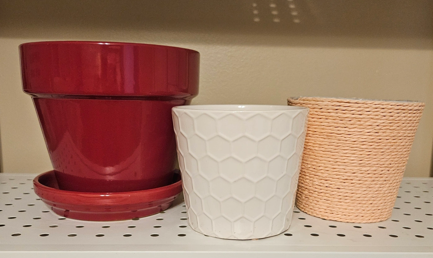 Rust ceramic with saucer, white ceramic with honeycomb pattern, and peach woven. Perfect to add some greenery for a warm, soothing space 🪴