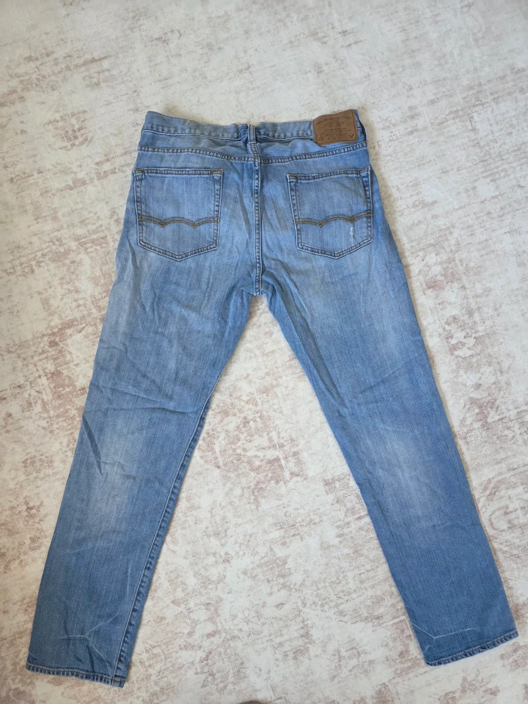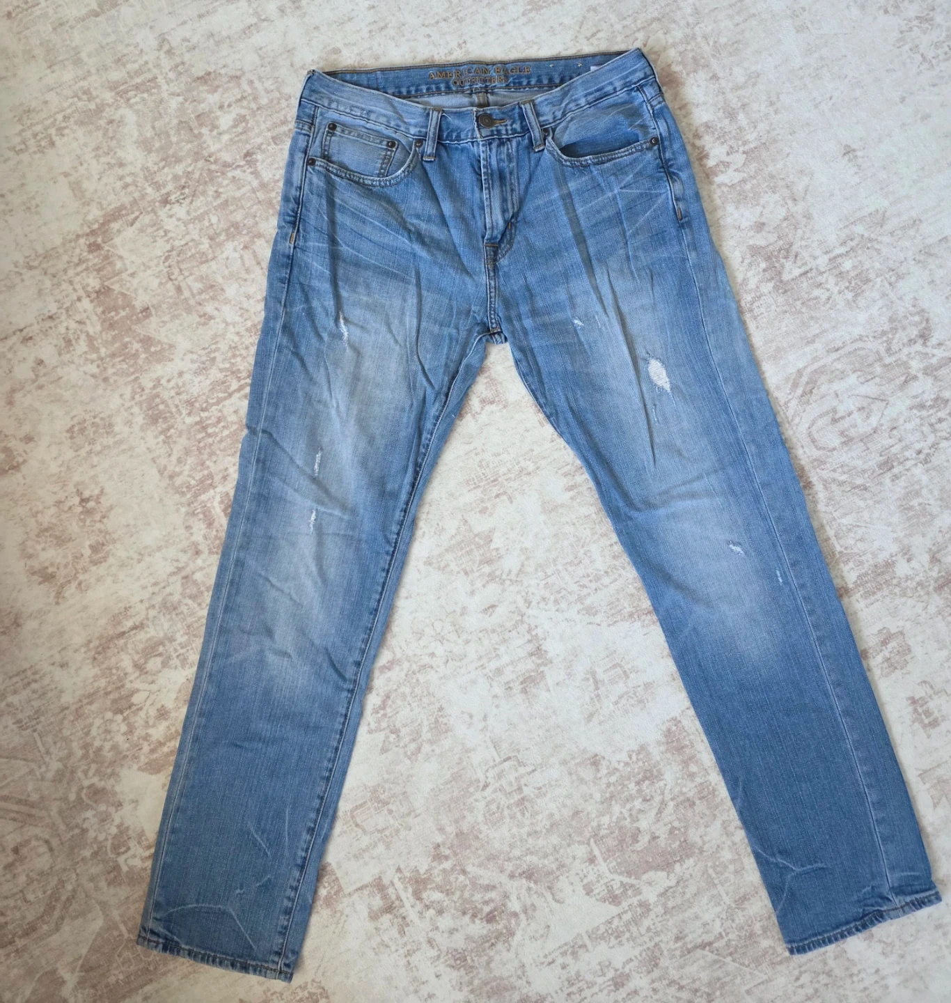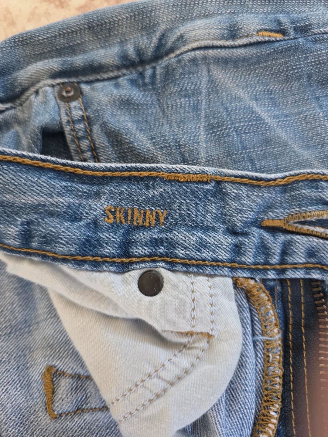 American Eagle Outfitters skinny jeans in a light wash blue denim. These jeans feature distressed details and a classic five-pocket design. Made from durable denim material.