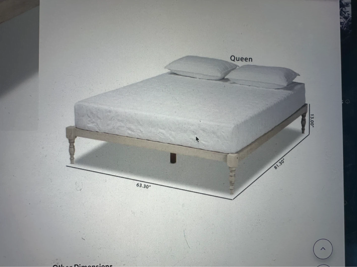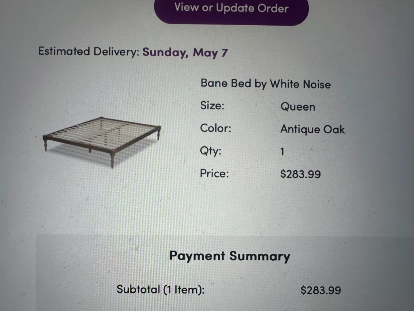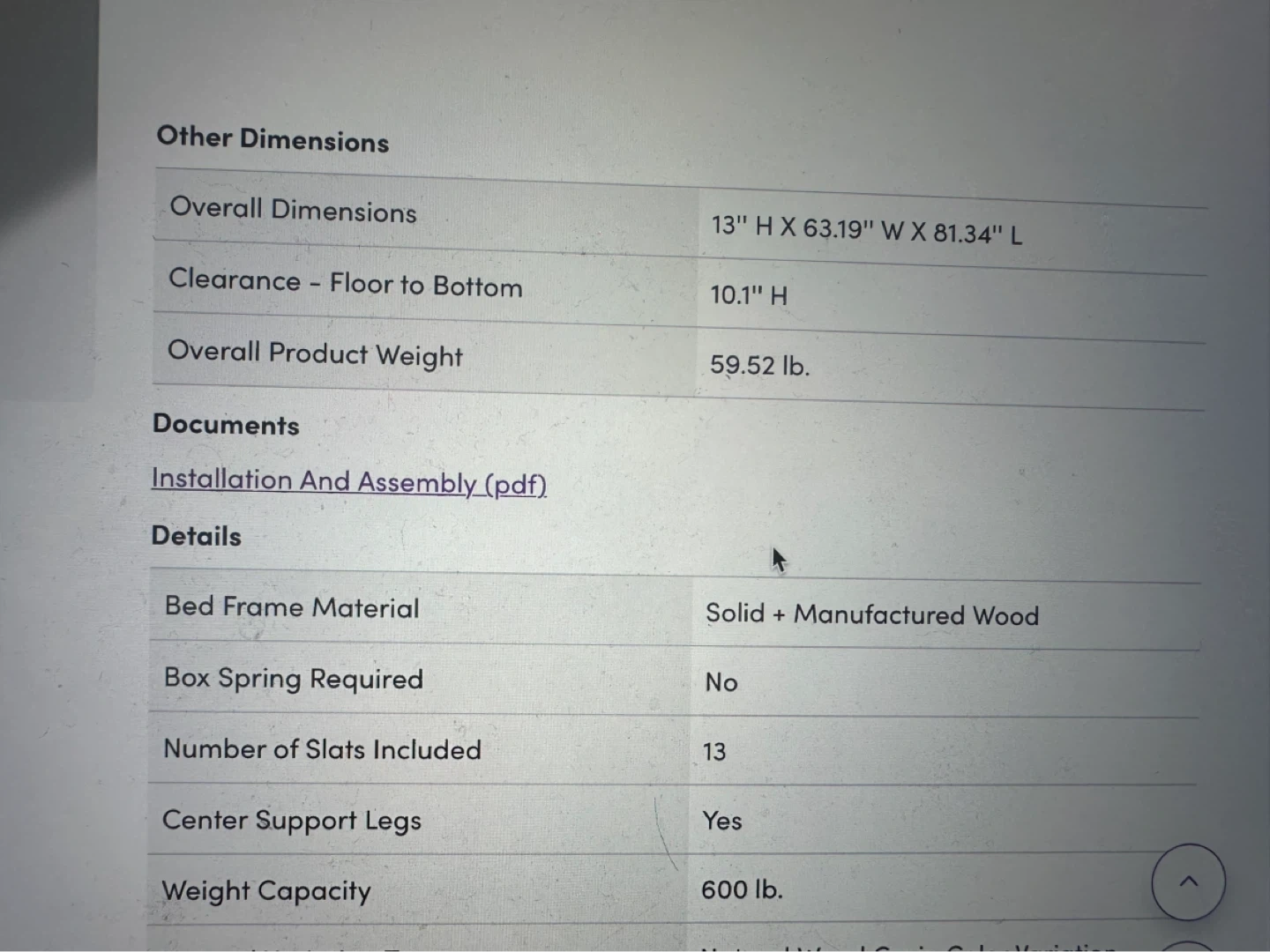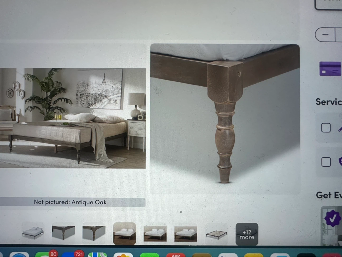 This is the White Noise Bane bed frame in Queen size and Antique Oak color. It's made from solid + manufactured wood. The frame includes 13 slats and center support legs.