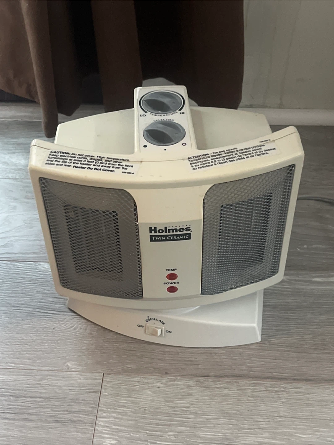 This is a Holmes Twin Ceramic heater. It features two heating elements for efficient warmth. The oscillate function can be turned on or off to distribute heat.