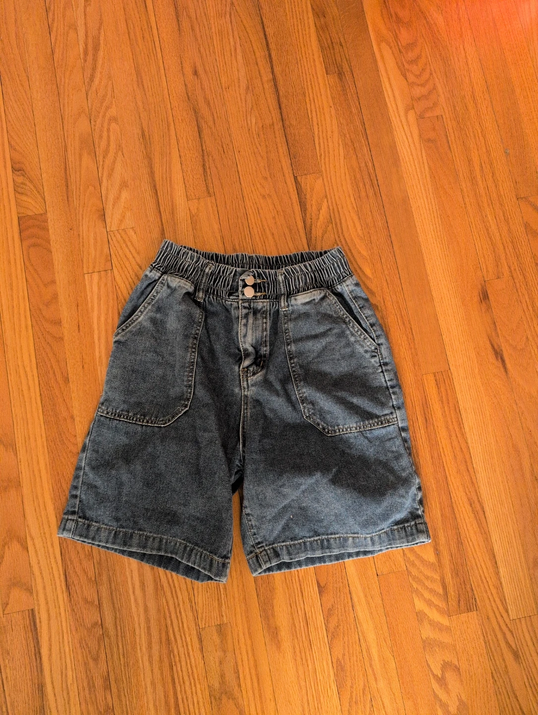 These are comfortable denim shorts with an elastic waistband and two front button closure. They have a relaxed fit and are made from a soft denim material. Pockets at the front and back are a practical addition. These shorts are great for casual wear during warmer weather! Says XL, but fits more like medium