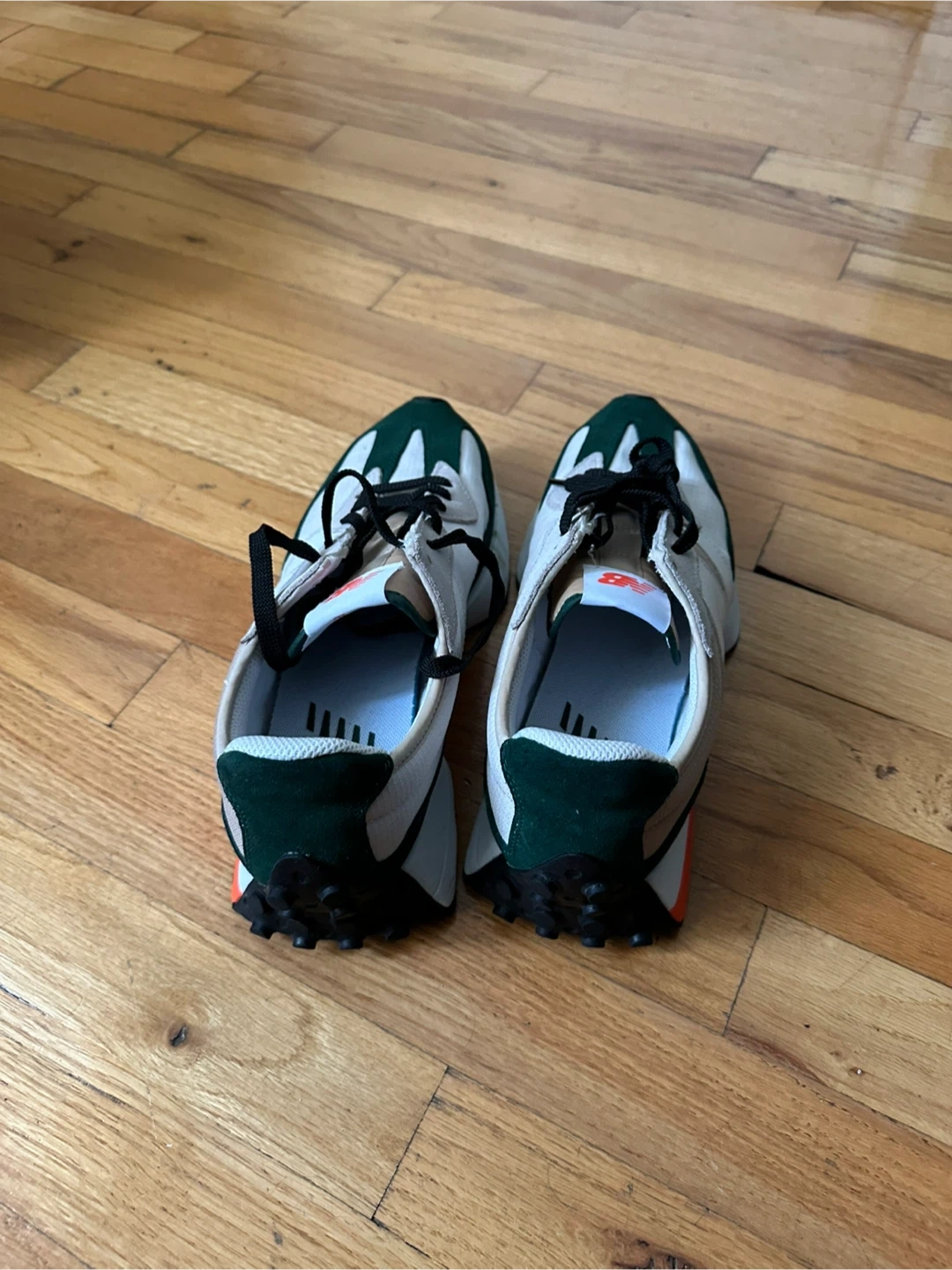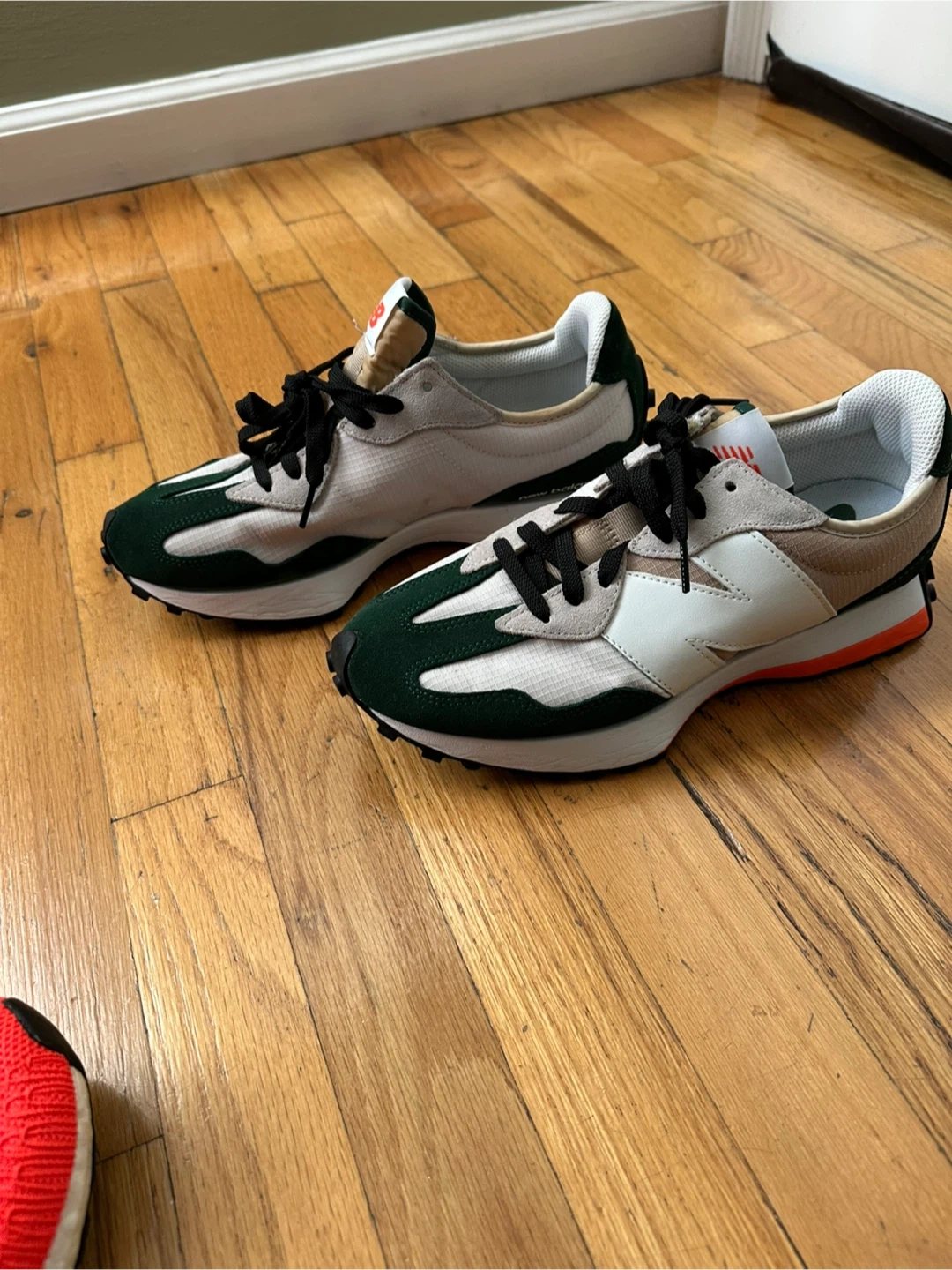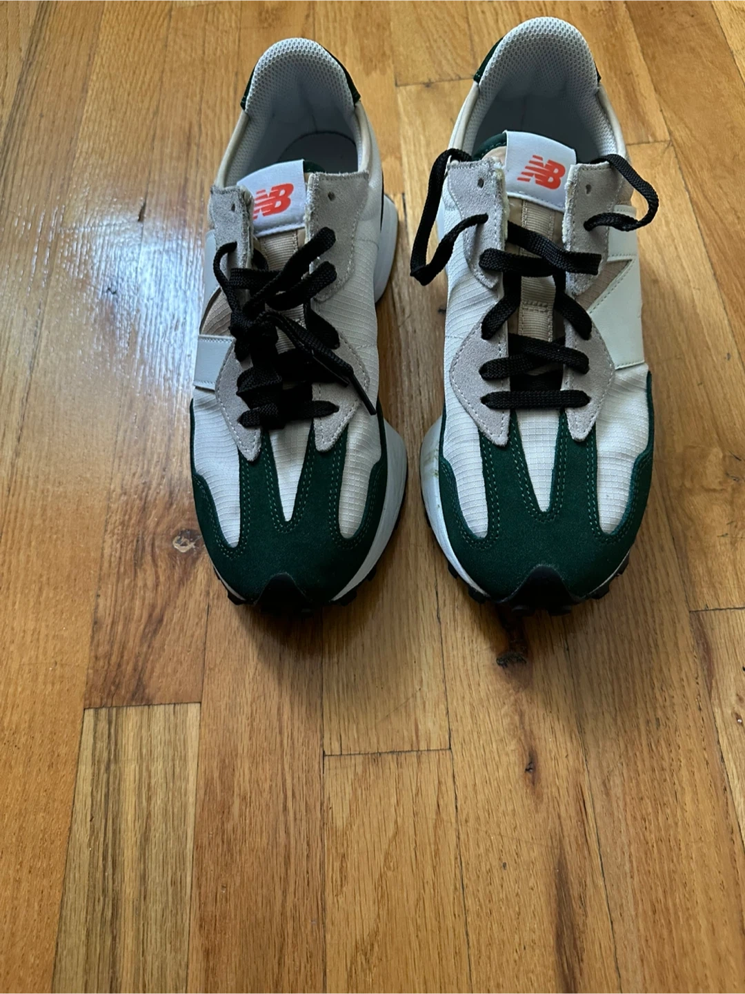 These New Balance 327 sneakers feature a white, tan, and green colorway. They have black laces and a durable rubber sole.