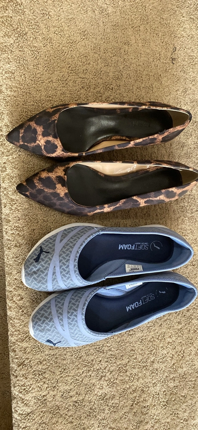 Pair of leopard print pointed-toe heels. Pair of light blue Puma Softfoam slip-on shoes. Comfortable footwear options. Puma $15