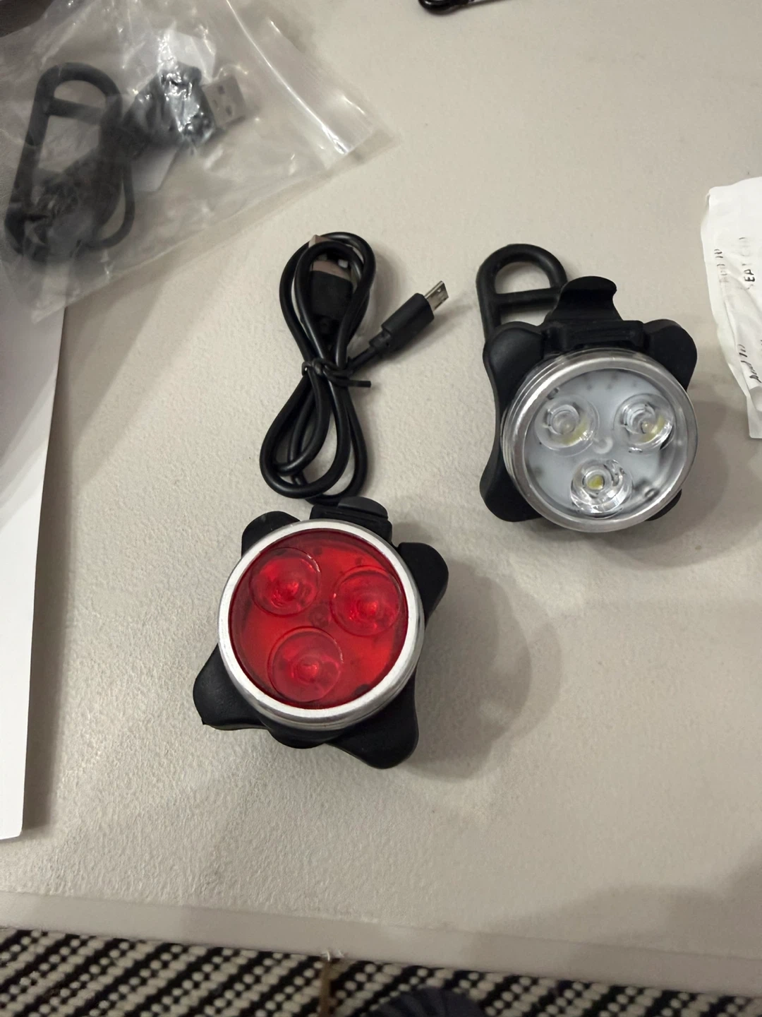 Selling a set of bike lights, including a white front light and a red rear light. They both appear to be in good condition and come with a charging cable