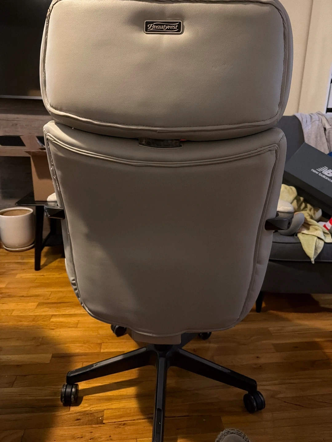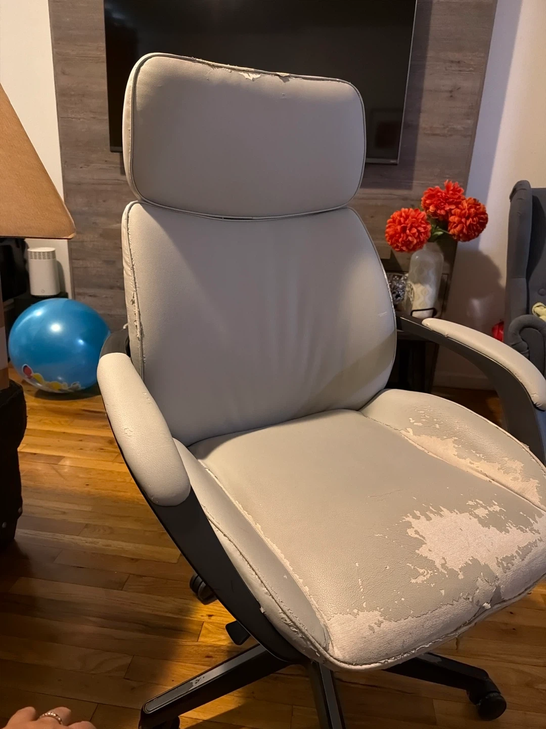 Gray executive office chair by Beautymist. Faux leather upholstery shows wear and peeling on the seat. Ergonomic design with adjustable height and casters for mobility. Good for a home office setup.