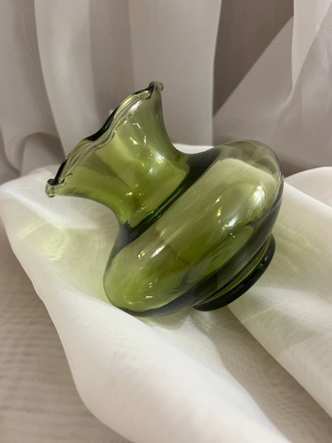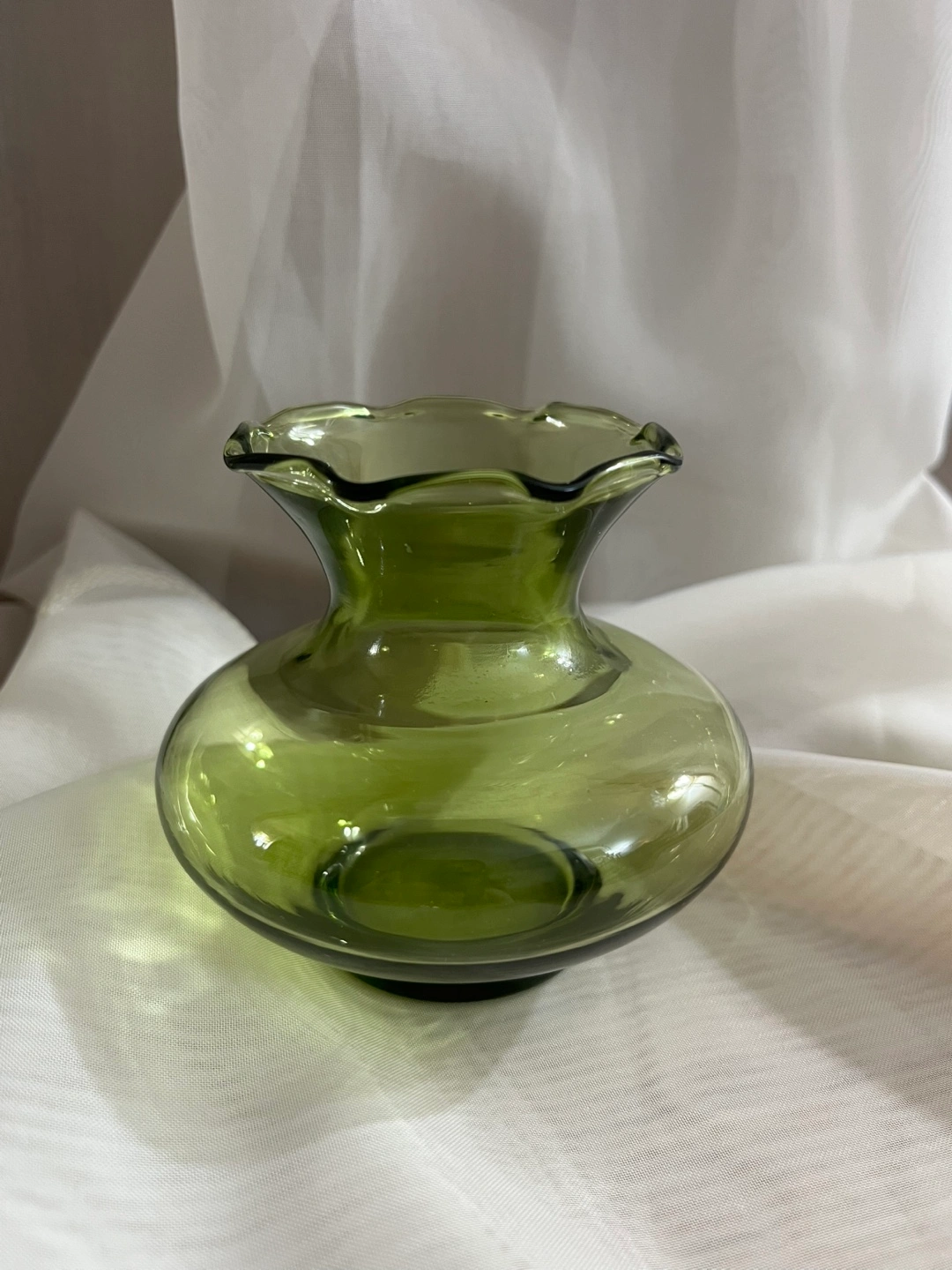 Here's a cute green glass vase! It would look great with some flowers or as a standalone piece. The size is shown in the pictures, take a look!