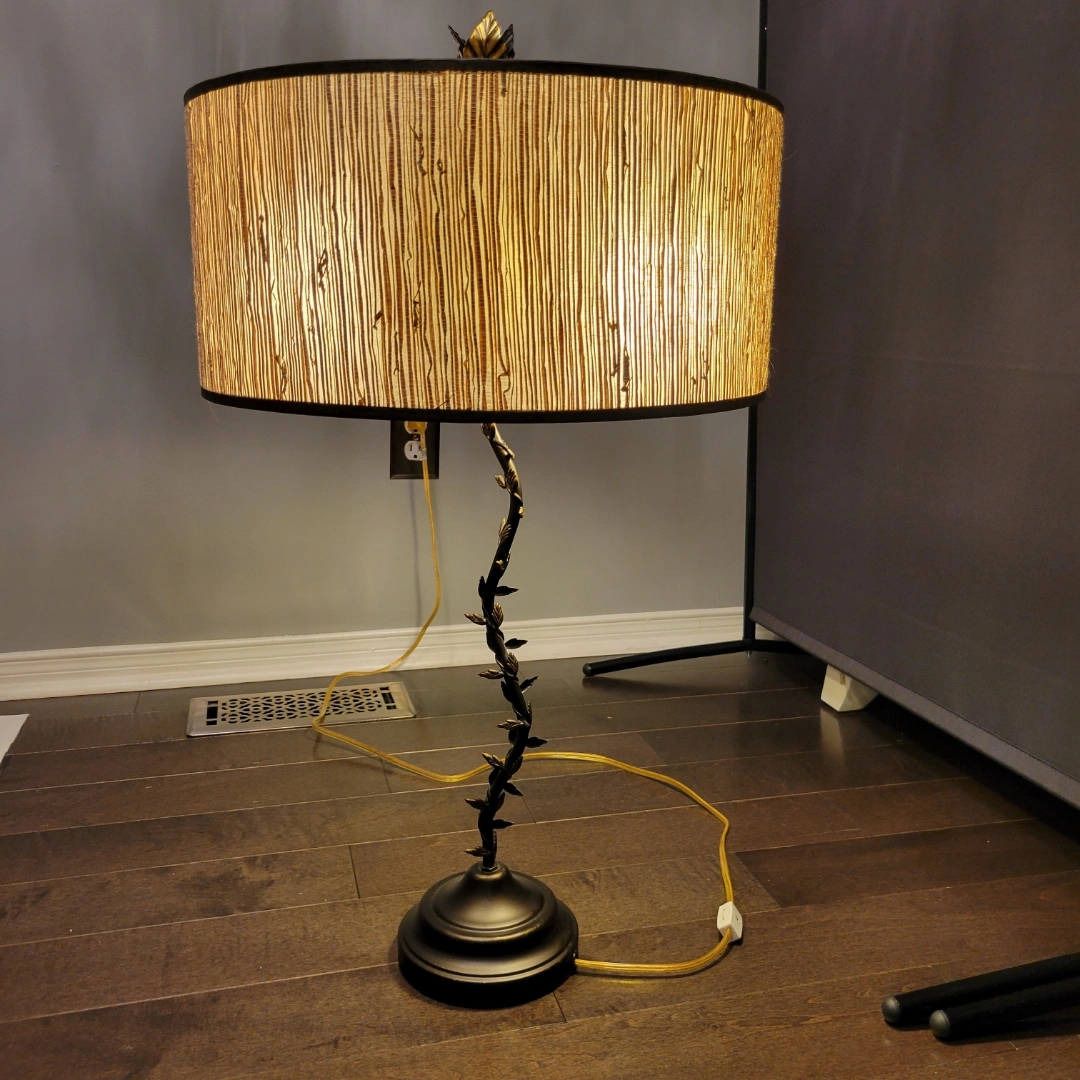This table lamp has a leaf design on the base and a brown and cream coloured lampshade. It is in good condition with no major signs of wear. Pickup preferred
