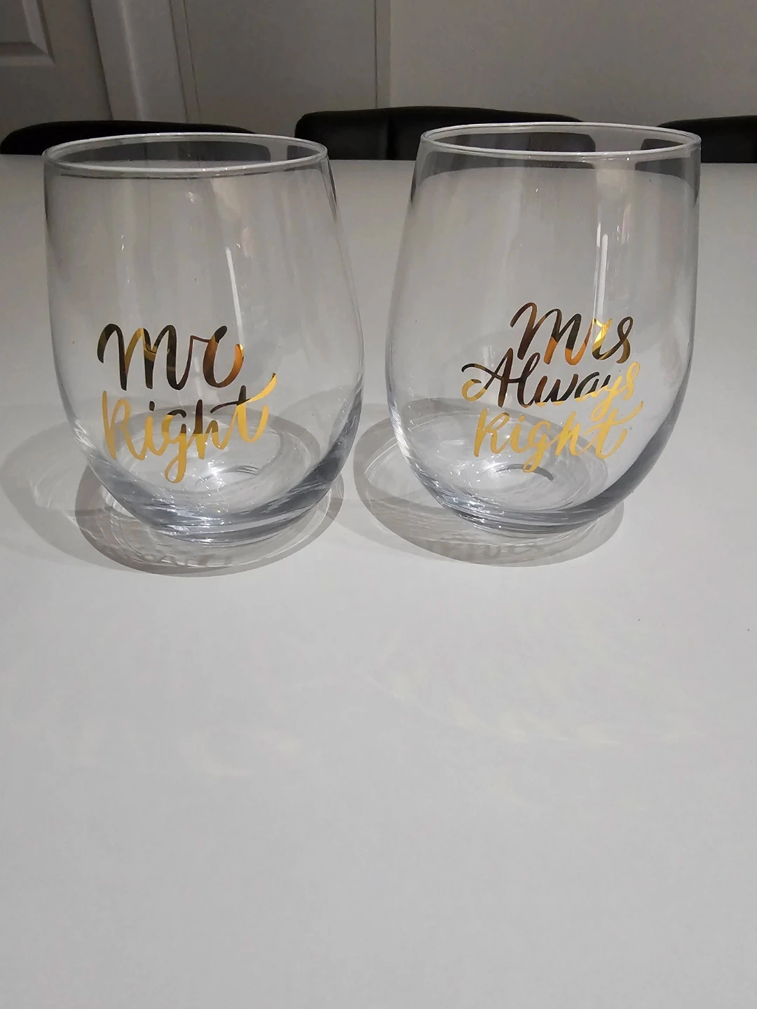 Cute set of two stemless wine glasses for a couple. One glass says 'Mr. Right' and the other says 'Mrs. Always Right' in gold lettering. Perfect for wedding gifts or anniversary celebrations! Never used but no box.