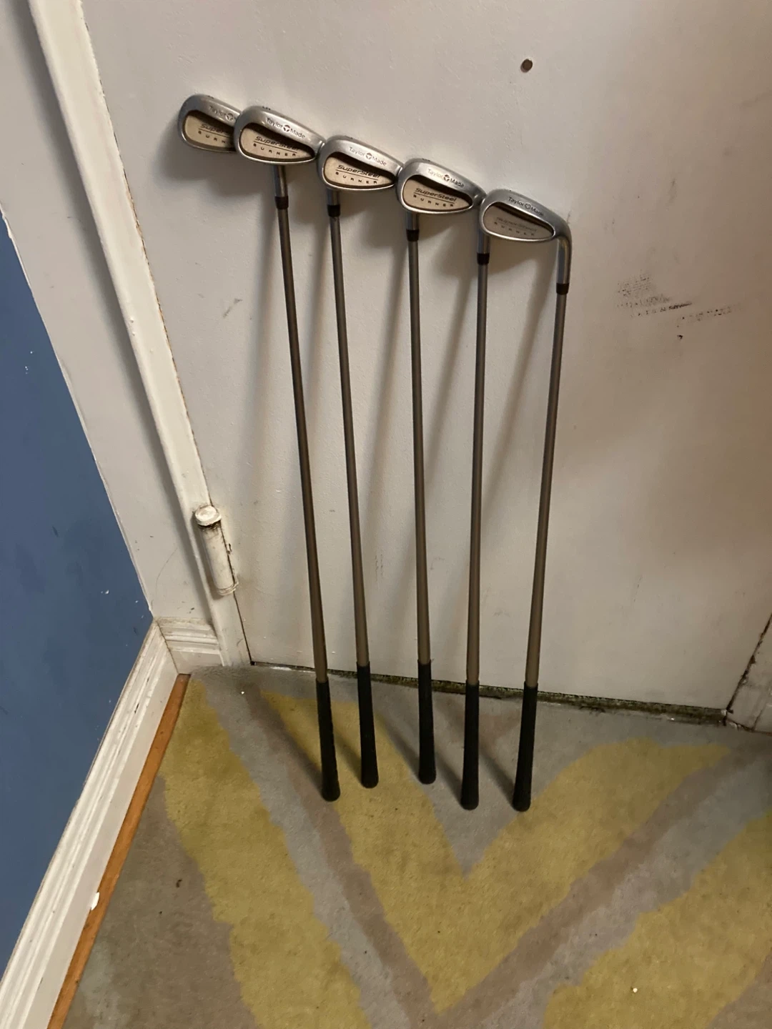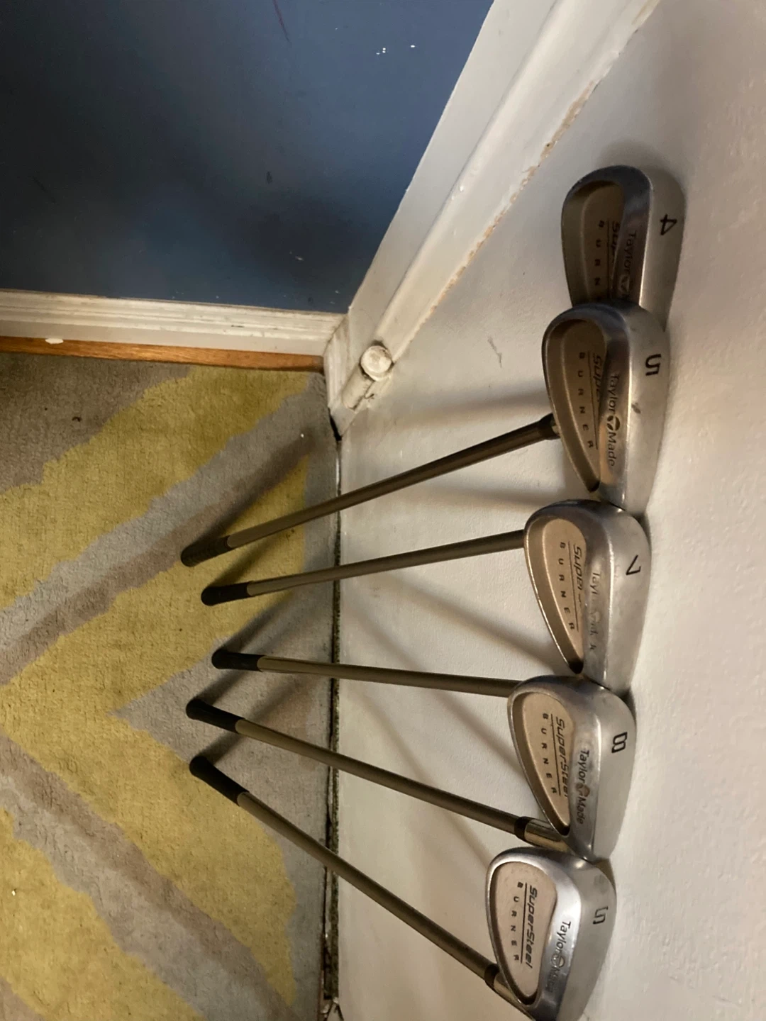 Selling a set of six TaylorMade SuperSteel Burner golf irons. This set includes irons 4, 5, 7, 8, and Sand Wedge. They have graphite shafts and black grips. I am selling them 10$ each but if you buy all 5 of them then it is $40.