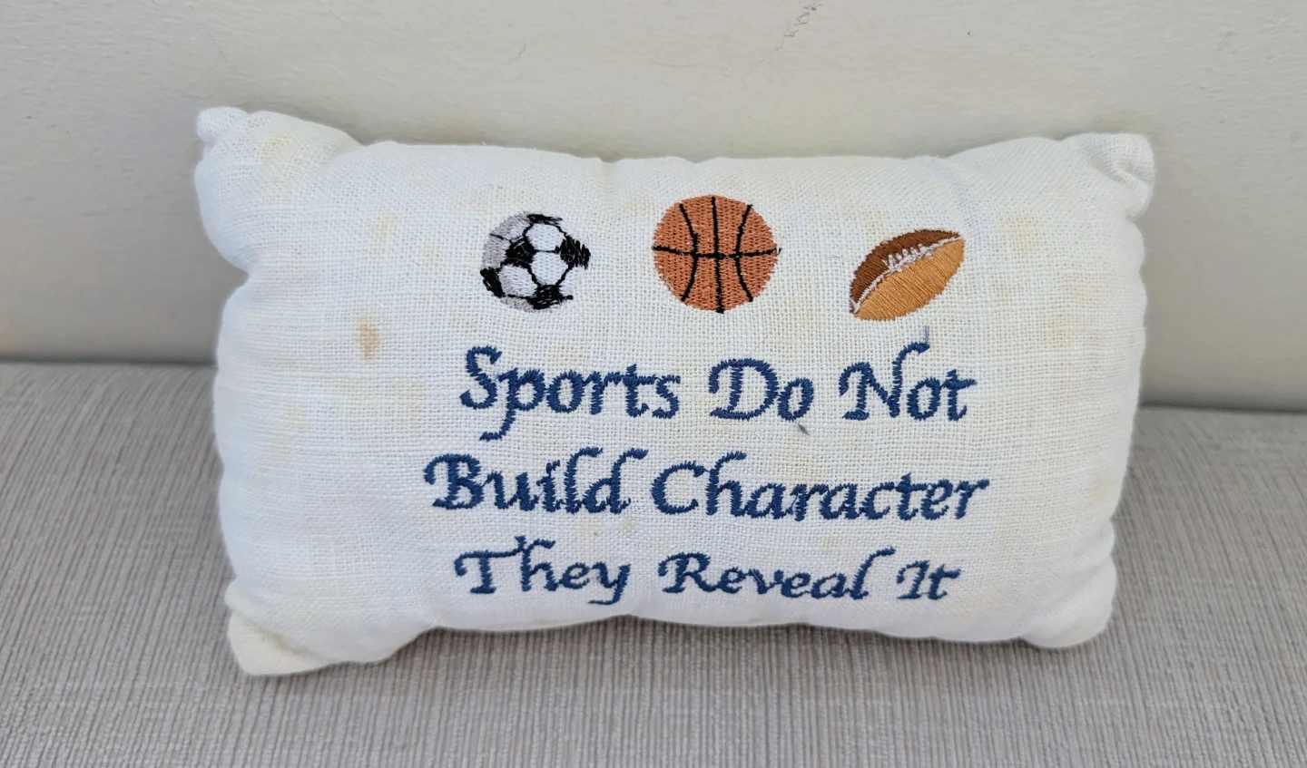 This decorative pillow features embroidered sports icons and the quote 'Sports Do Not Build Character They Reveal It'. It's made of a white fabric.