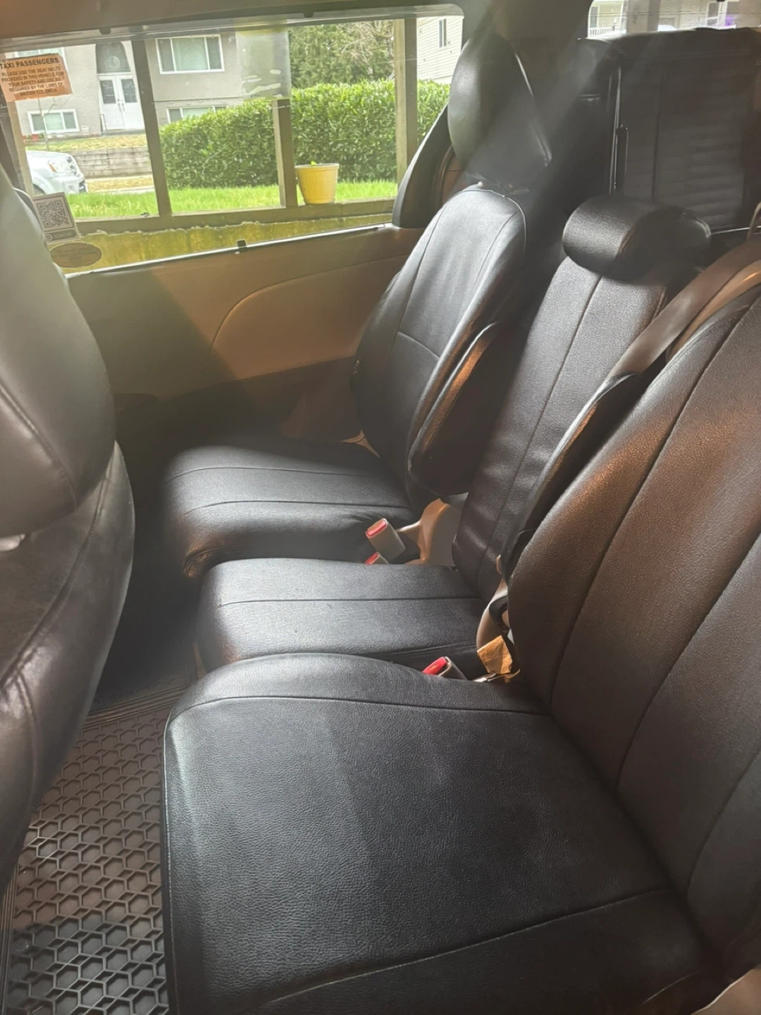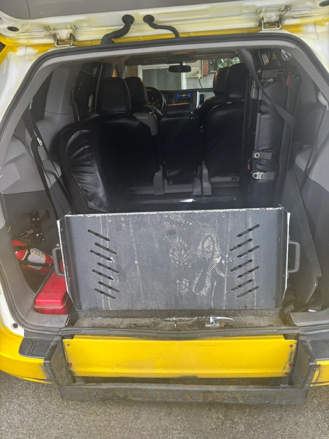 This van is equipped with a ramp for wheelchair access. It features black leather seats and has a 7-passenger capacity. The vehicle has been modified for accessibility needs.